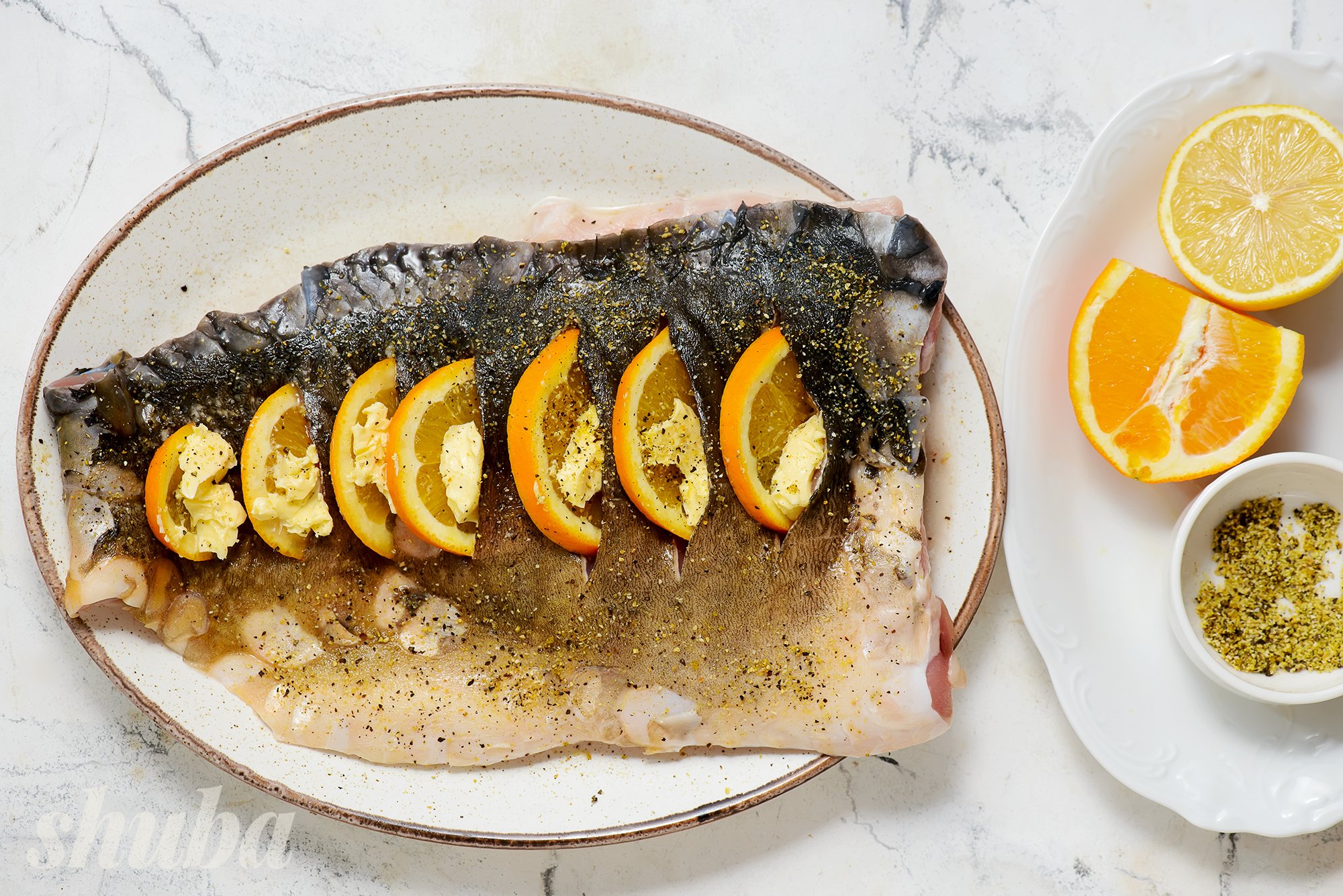 Подавайте запеченого коропа зі шматочками апельсина та подрібненою петрушкою.