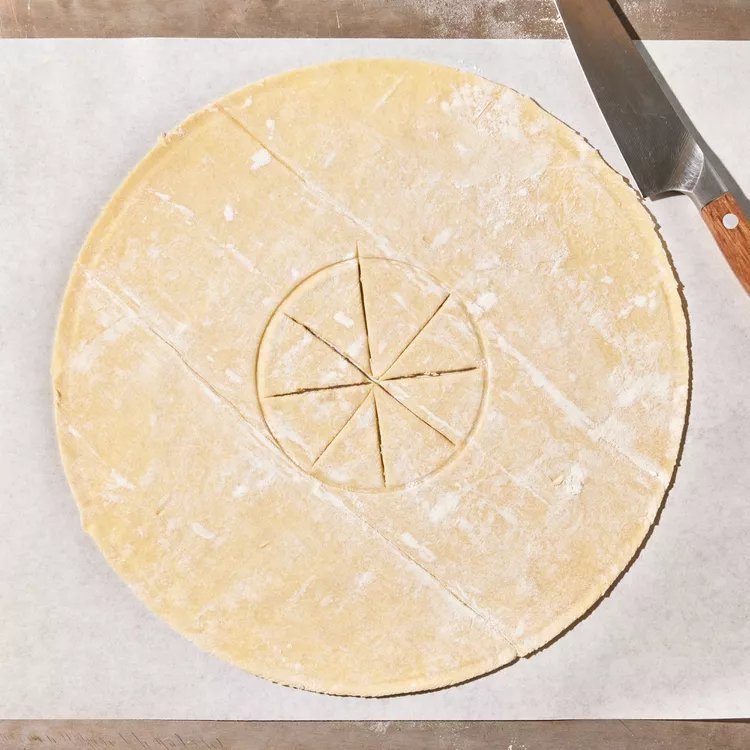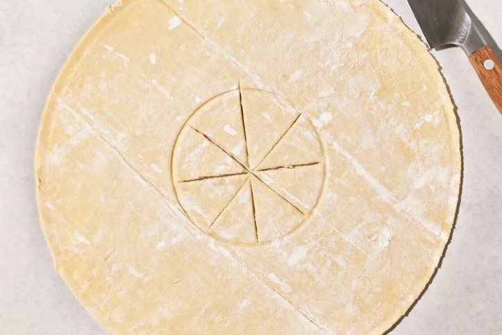 Переверніть миску діаметром 10 см на центр кола з тіста й обведіть її ножем, не прорізаючи тісто.