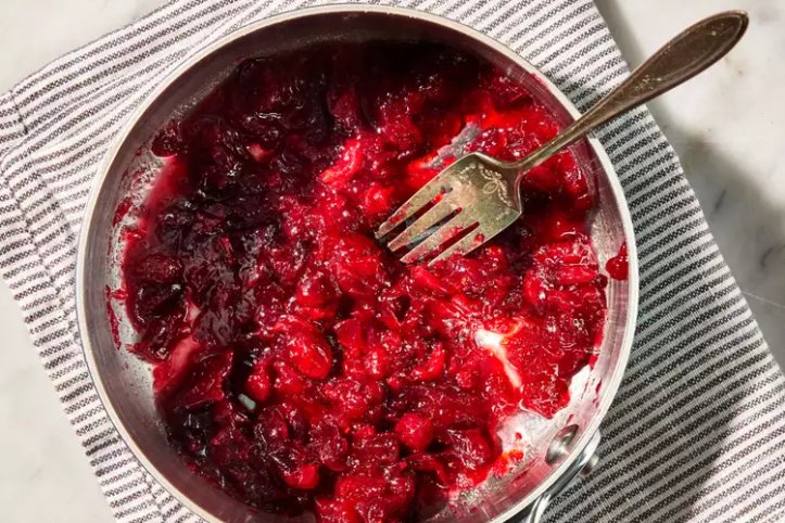 - Нам потрібна журавлина, щоб приготувати соус. До нього додамо цукор і трохи апельсинового соку. Щоб заощадити час, ви можете купити журавлинний соус у супермаркеті.