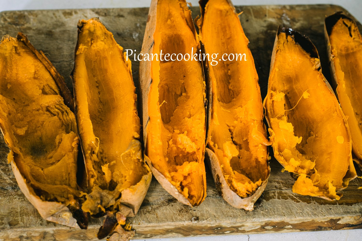 Тим часом батат ретельно помити, обсушити й вставити до розігрітої духовки й пекти, доки він повністю зм’якне і можна буде його легко простромити ножем.