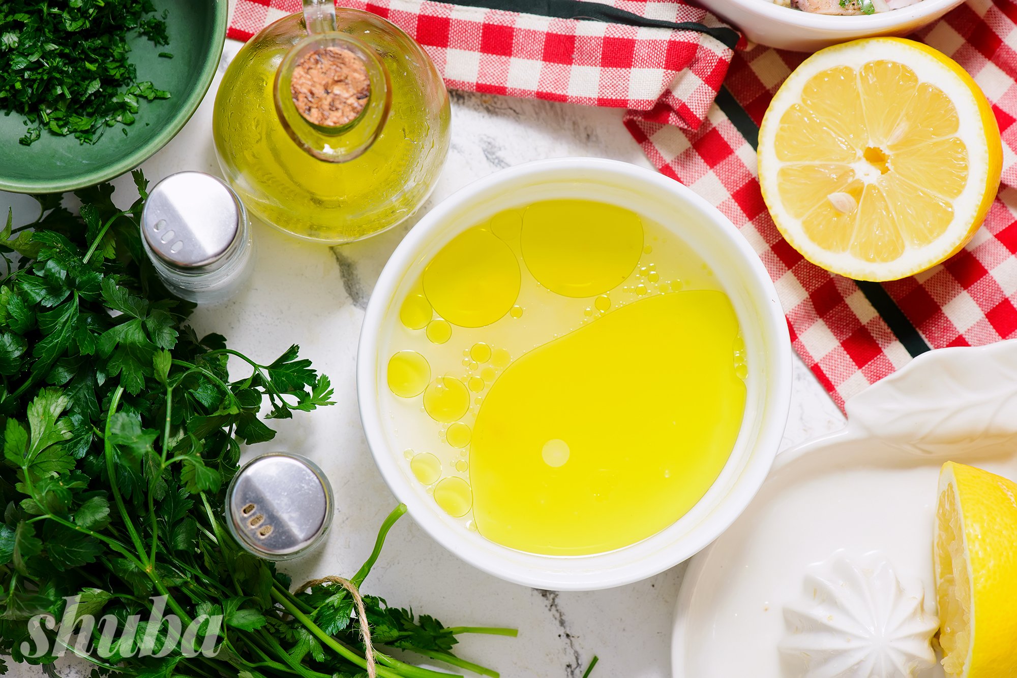 Для салату готуємо максимально просту і дуже смачну заправку із секретним інгредієнтом. Спеції можеш додавати на свій смак, але найкраще з ароматом дарів моря в цьому салаті поєднуються пахощі дрібно нарізаної свіжої петрушки.