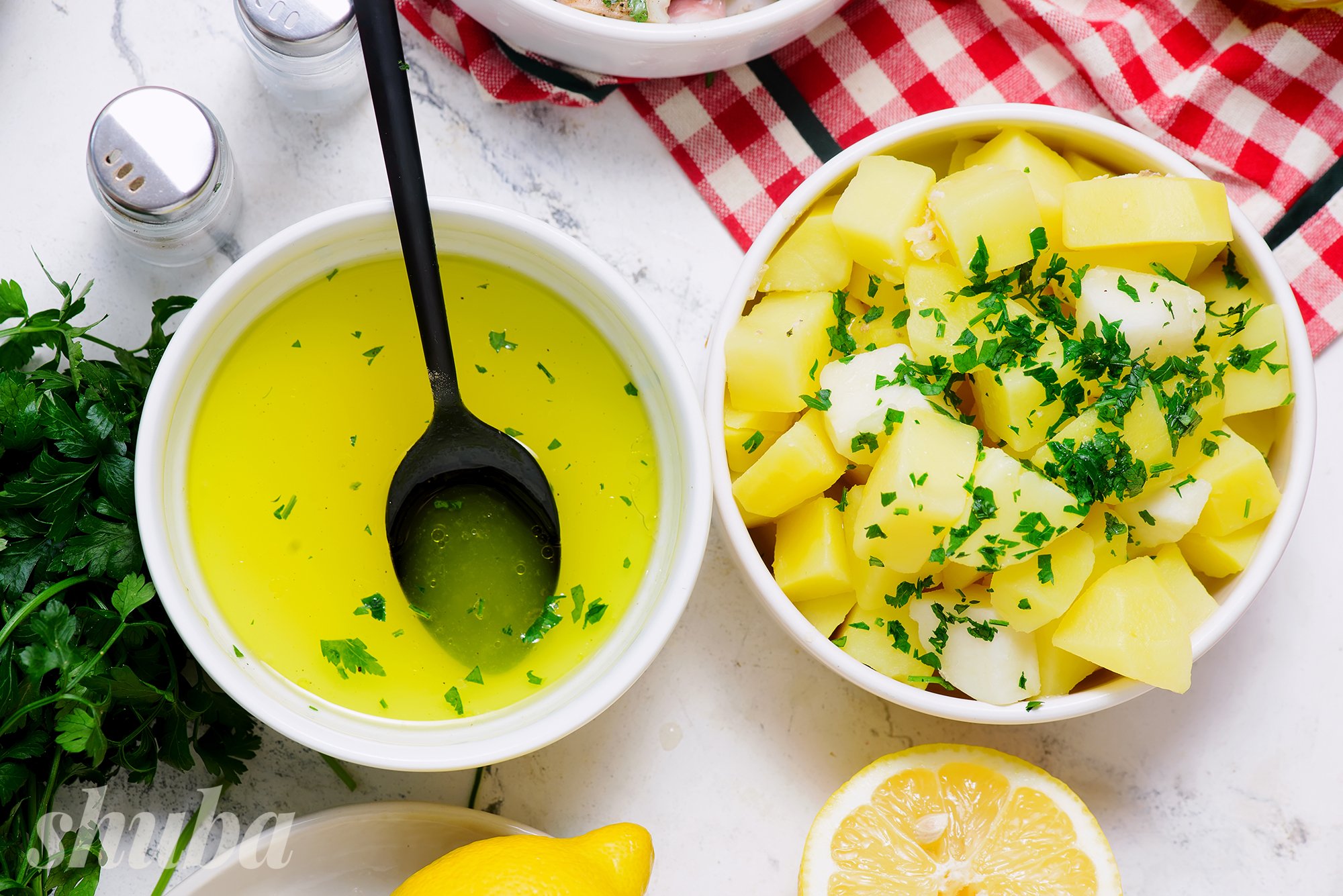 Можна порівняти смаки цієї страви та іншого цікавого салату з морепродуктами й картоплею, в якому трішки більше прянощів, а ще морепродукти попередньо готують у білому вині.