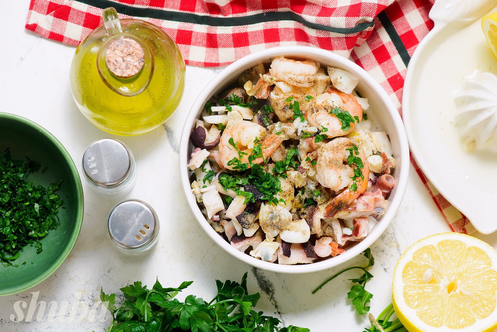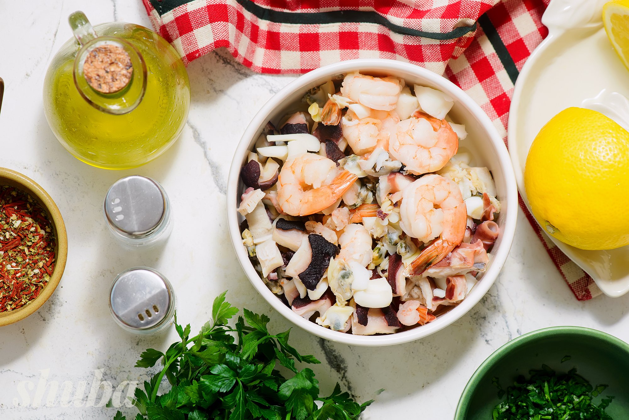 Зазвичай цей салат із морепродуктами готують зі свіжоморожених креветок та кальмарів, які попередньо відварюють та чистять. Але ти можеш скористатися пакетом замороженого морського коктейлю — це набагато швидше й простіше!