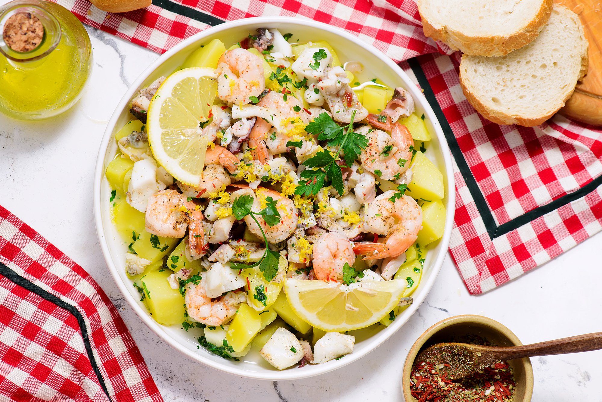 Не секрет, що італійська кухня багата дарами моря, і цей салат — один з найніжніших! Тут є легка кислинка від лимонного соку, свіжість петрушки, ситна картопляна основа. Та основне в салаті — ніжні креветки та інші багаті на білок складники морського коктейлю.