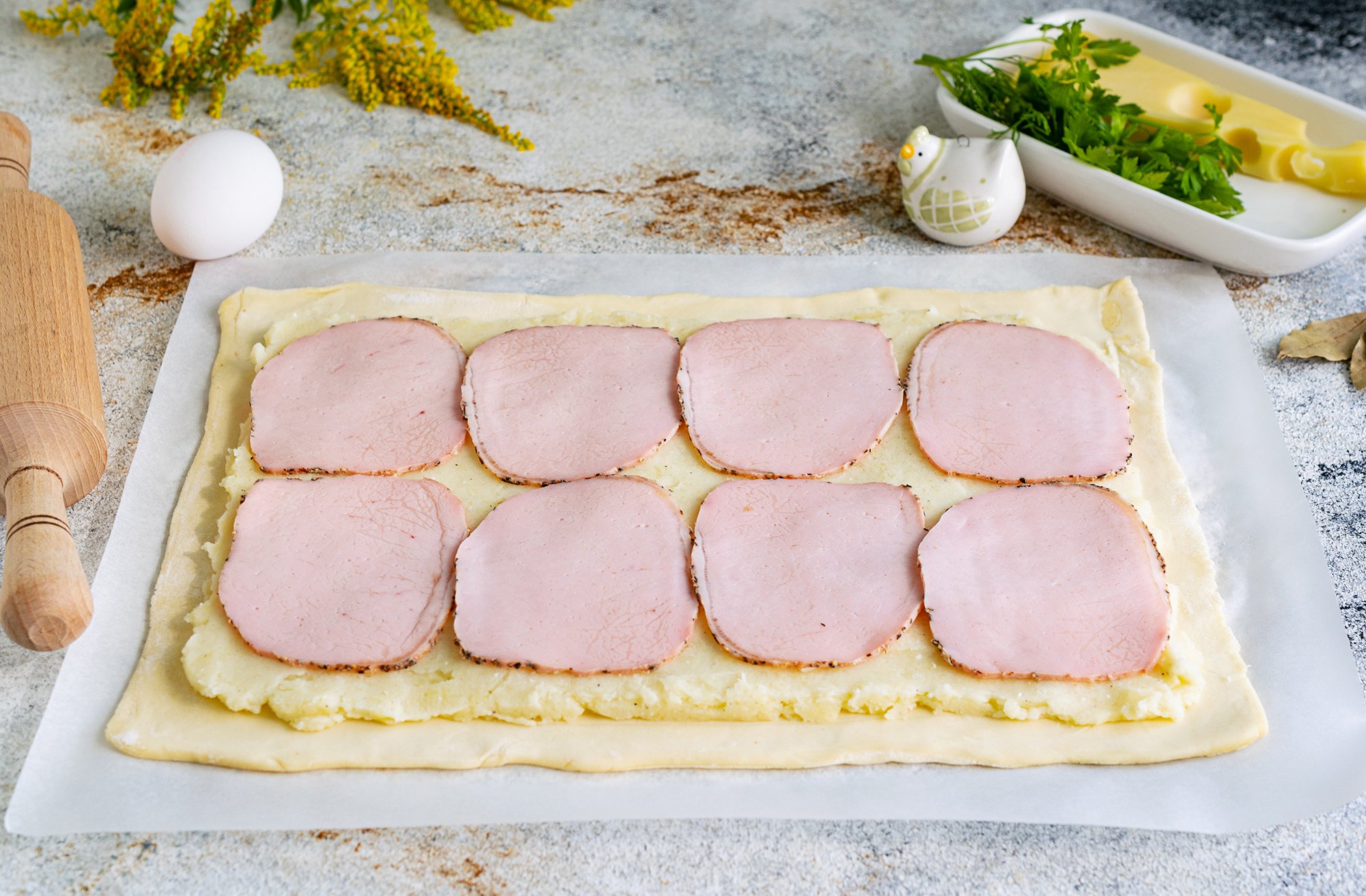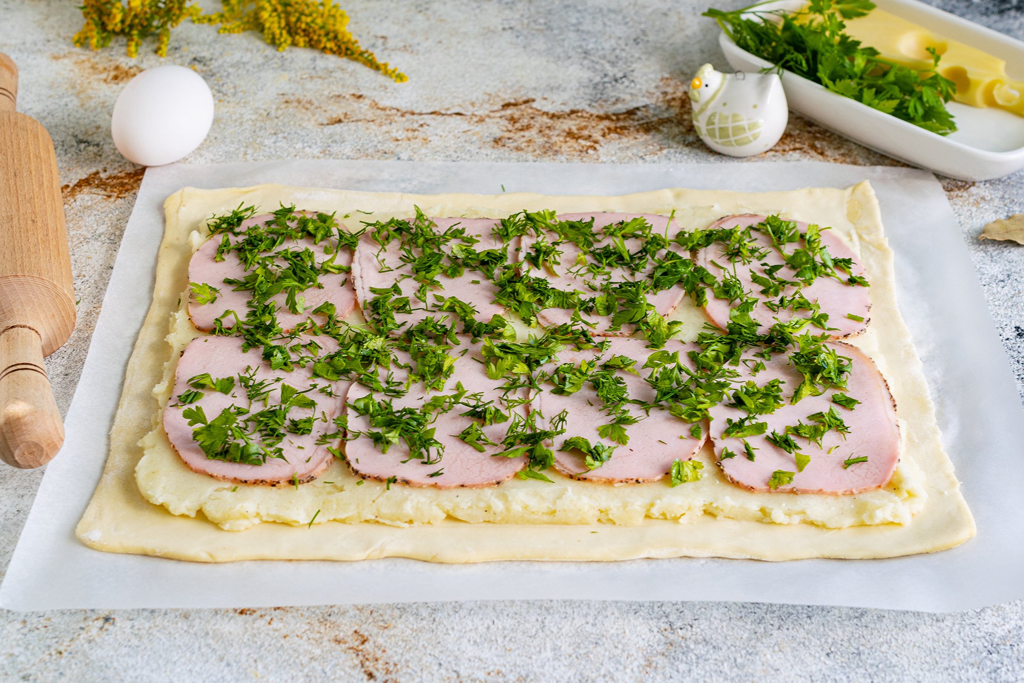 Пиріг з листкового тіста з картопляним пюре, шинкою та твердим сиром