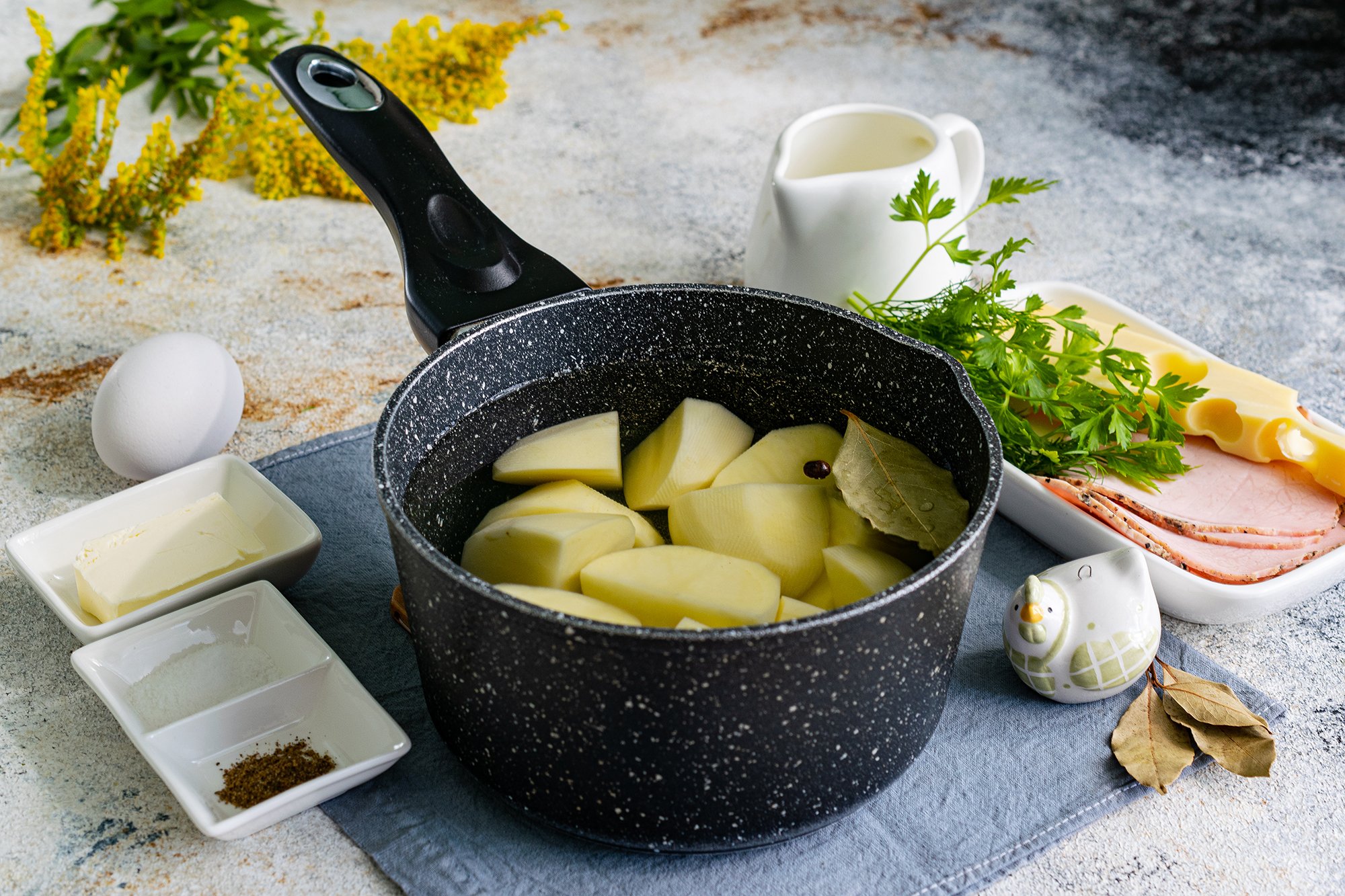 Картоплю помий, почисть від шкірки, розріж кожну бульбу на декілька частин. Переклади в ківш або невелику каструлю, залийте холодною водою.