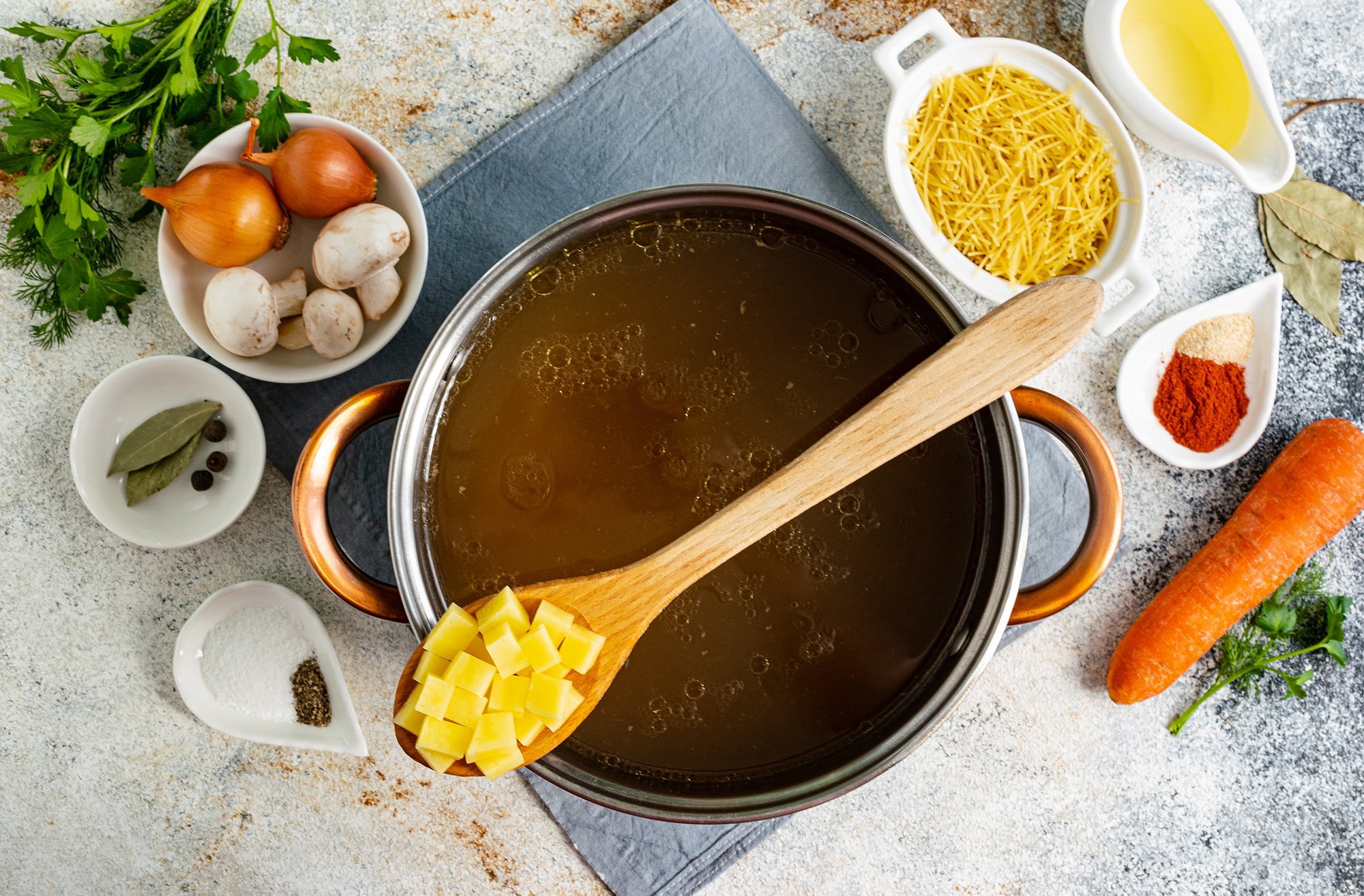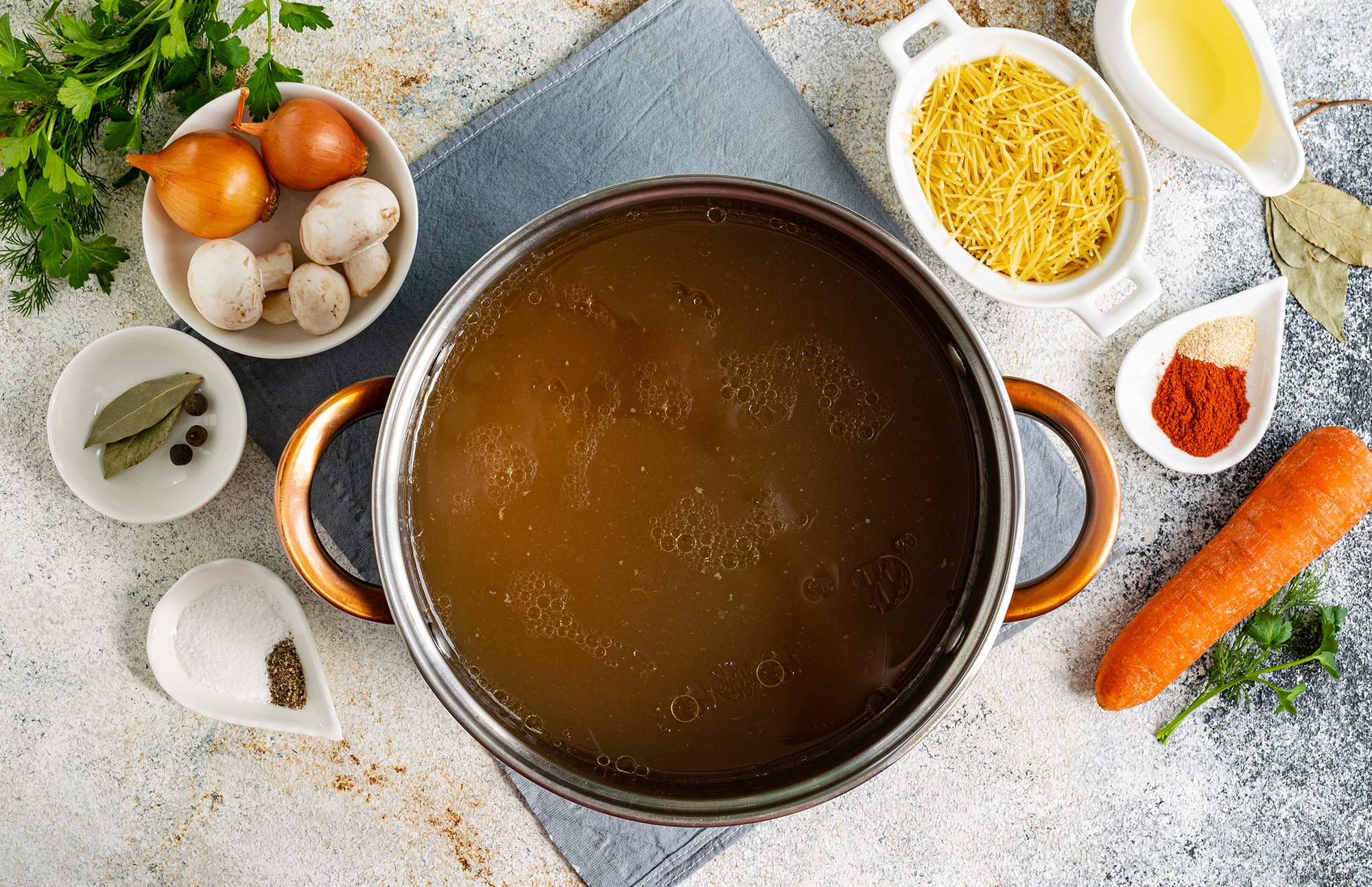 Порада: на бажання для аромату і красивого золотистого відтінку бульйону додай в каструлю ріпчасту цибулю, моркву та стебла селери.