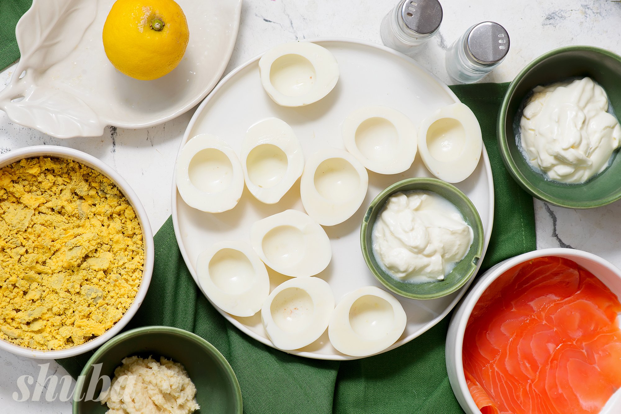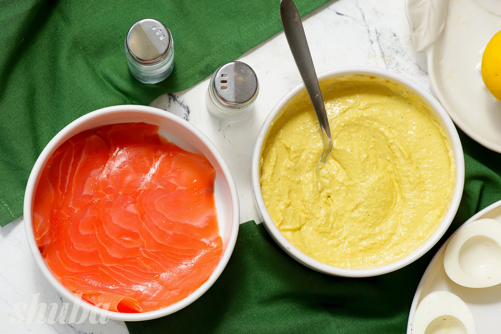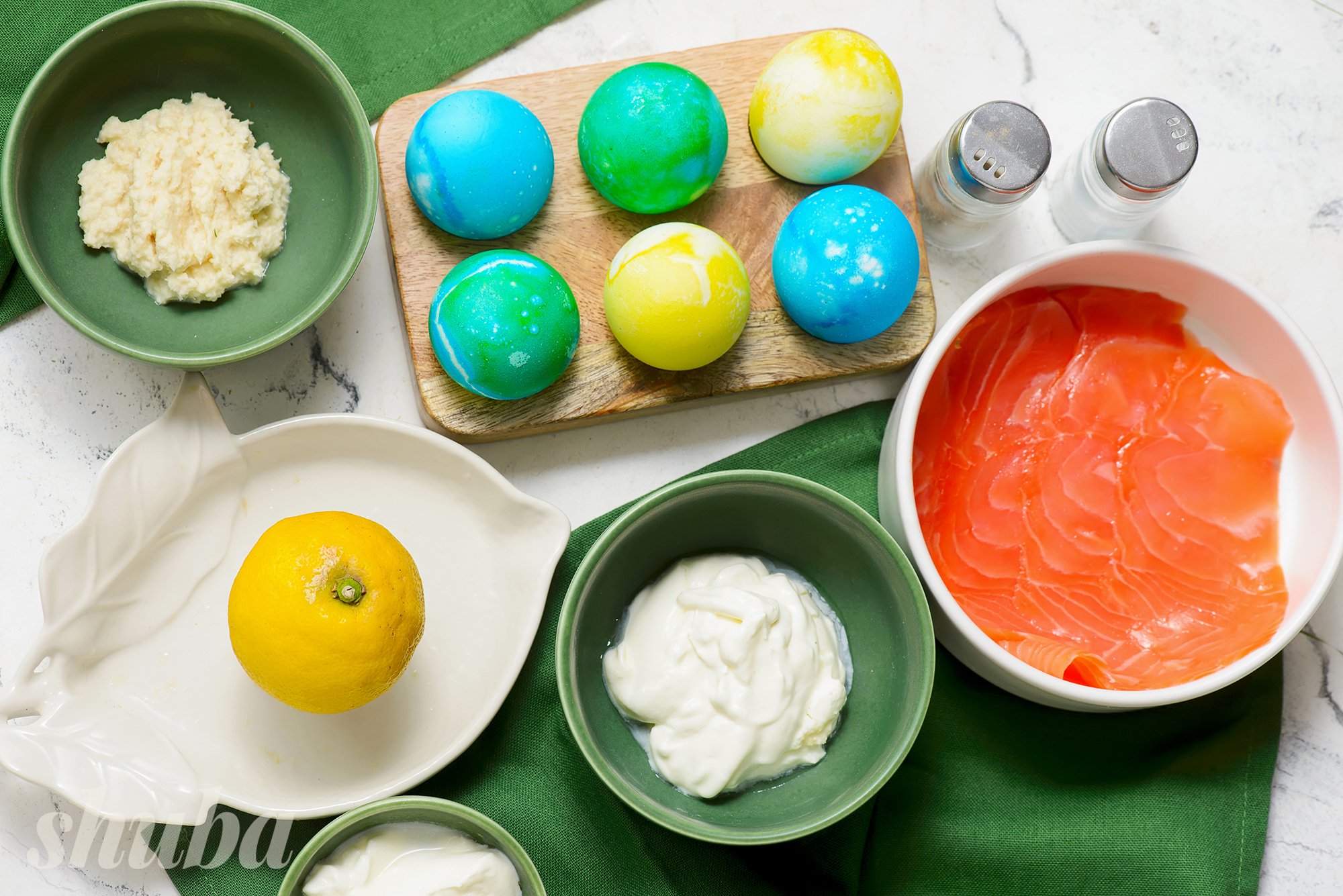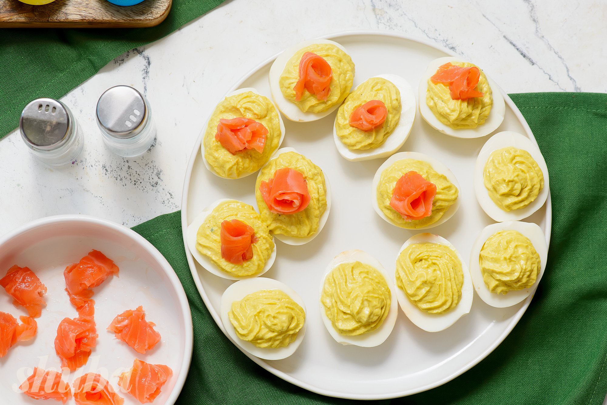 Великдень уже от-от настане, а ти все думаєш, що має бути на святковому столі? Чом би не поекспериментувати зі швидкими фаршированими яйцями? Цього разу зробимо пікантну закуску, а для прикраси використаємо шматочки копченого лосося.