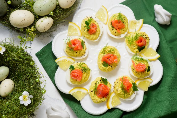 Для тих, хто не просто любить фаршировані яйця, а бачить у них простір для творчості; для тих, кому подобаються різні кольори й текстури; для тих, хто обожнює поєднання звичних інгредієнтів у незвичні смакові ансамблі — оригінальний польський рецепт фаршированих яєць із копченим лососем!