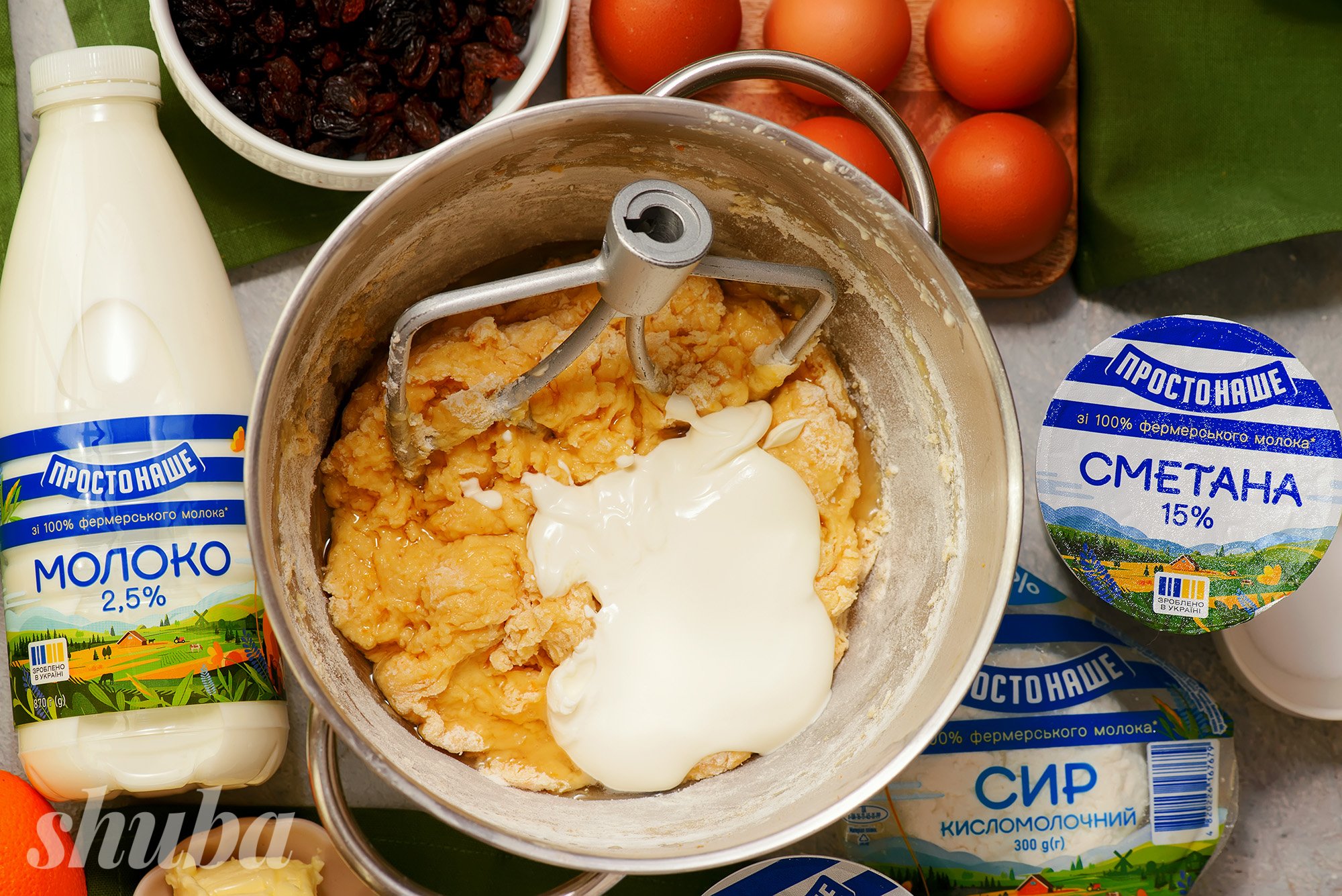 Для святкового крафіна радимо використати молочні продукти від ПРОСТОНАШЕ, вони ідеальні для сирної випічки. Нам потрібні молоко 2,5% та сметана 15% для тіста, і кисломолочний сир 5% для начинки.