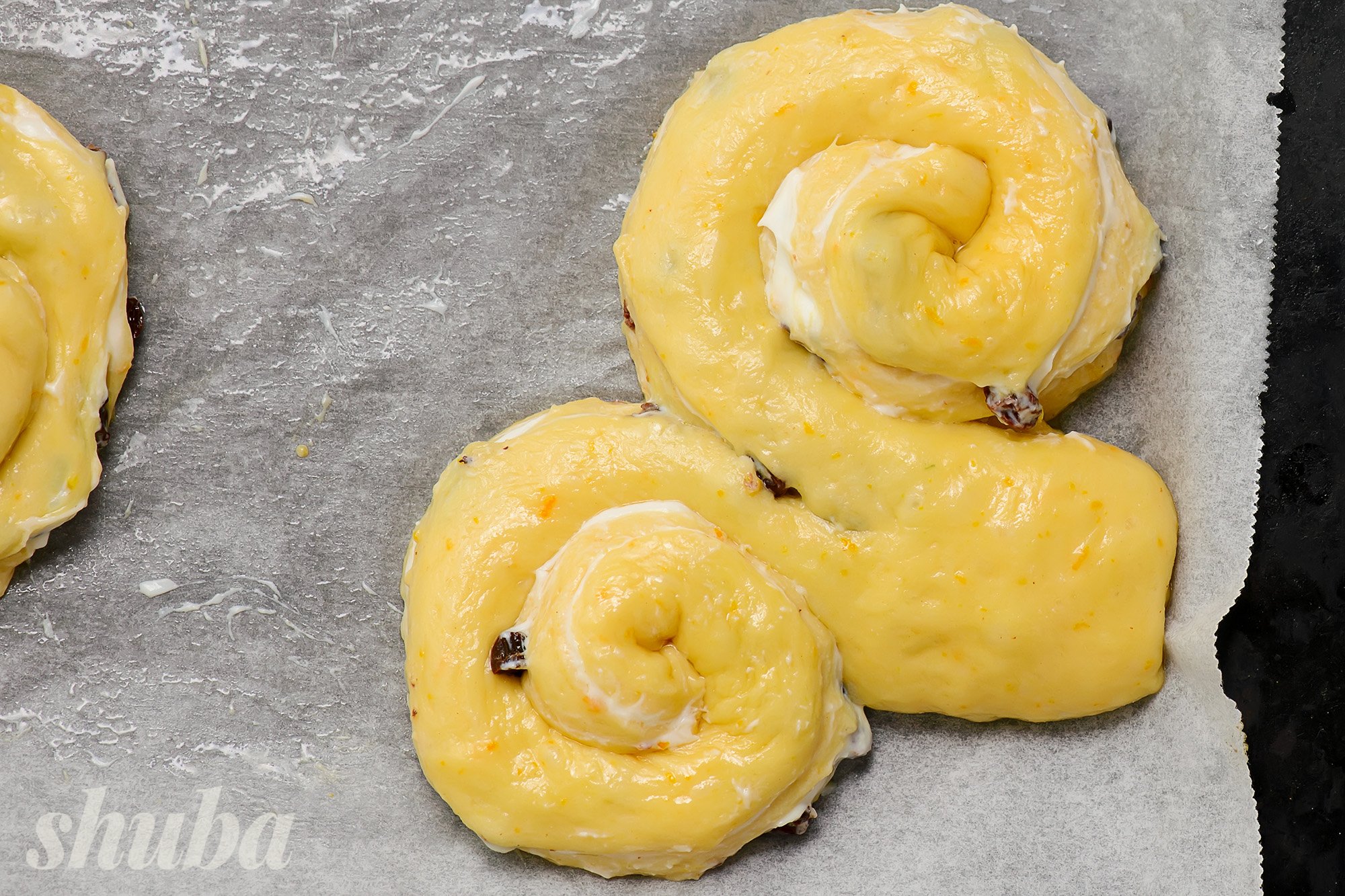 Виклади заготовки у формочки для пасок так, щоб одна спіраль опинилася над іншою.