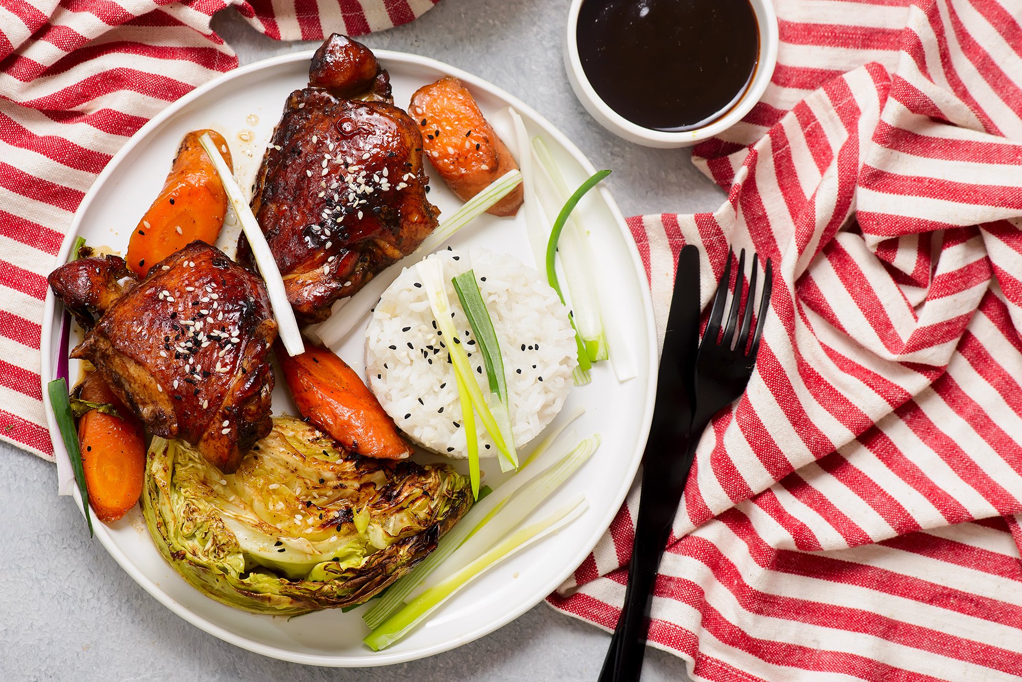 Соковита курочка на вечерю — саме те, що потрібно. А соус теріякі додасть до її смаку солодко-солоних ноток. Важливе доповнення до м’яса — морква та молода капуста. Запікаючись, курка насичує своїми соками овочі, завдяки якому створюється вдалий смаковий ансамбль.