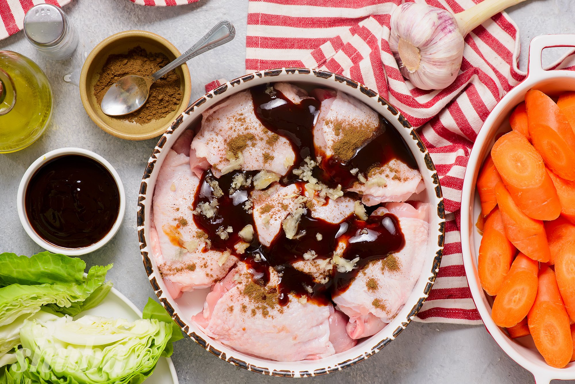 Страву готуємо з курячих стегенець або гомілок — важливо, щоб шматочки курки були однакового розміру. Запікаємо курку на подушці з моркви та молодої капусти.