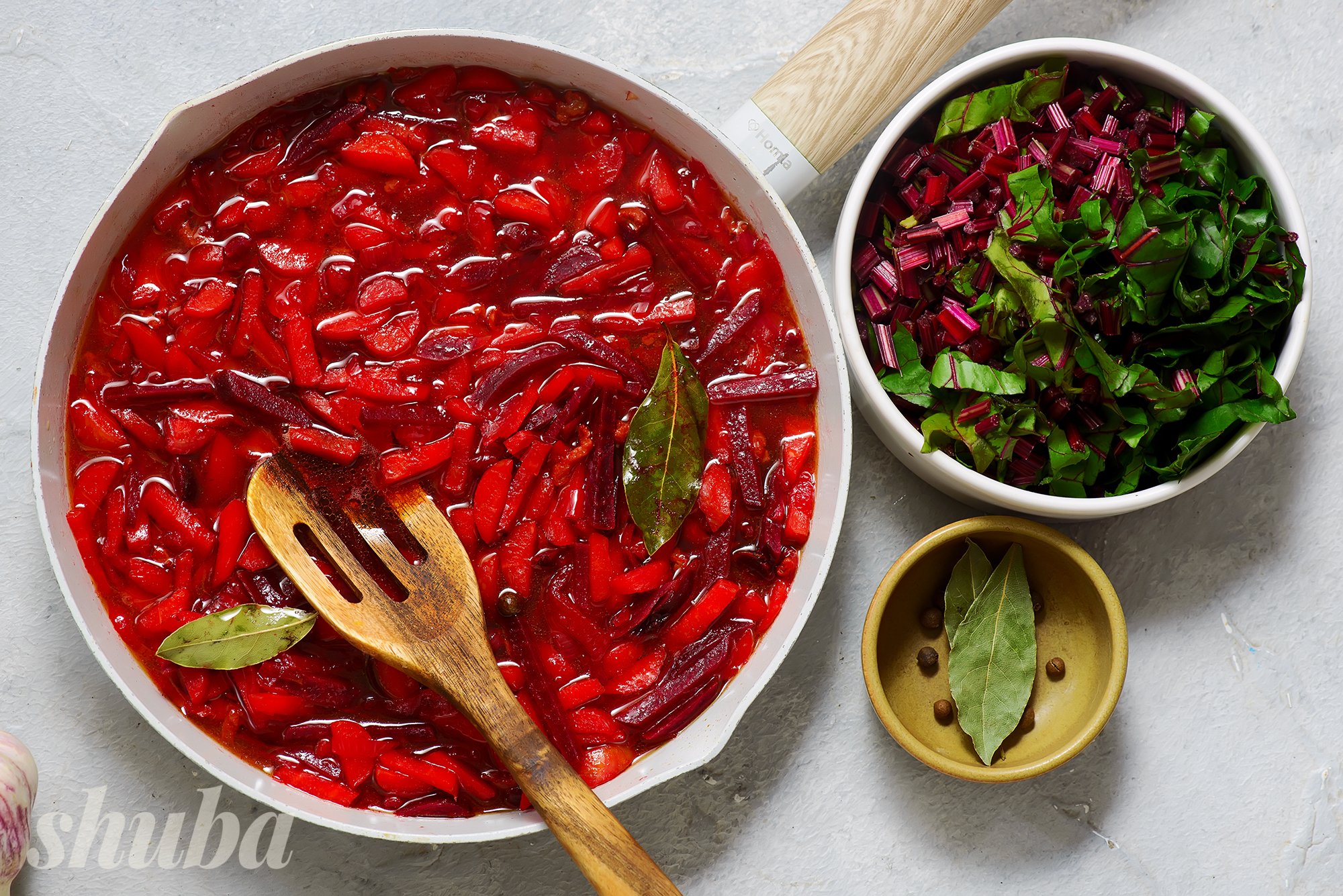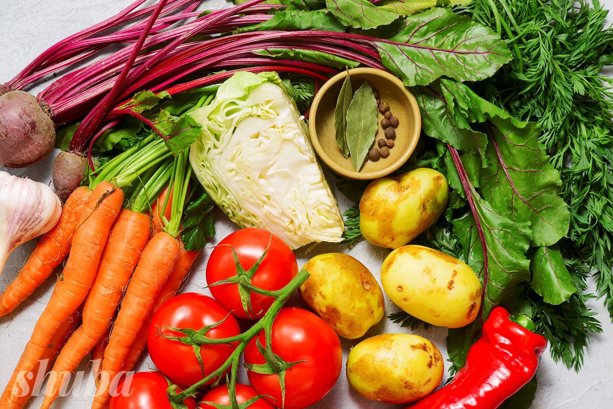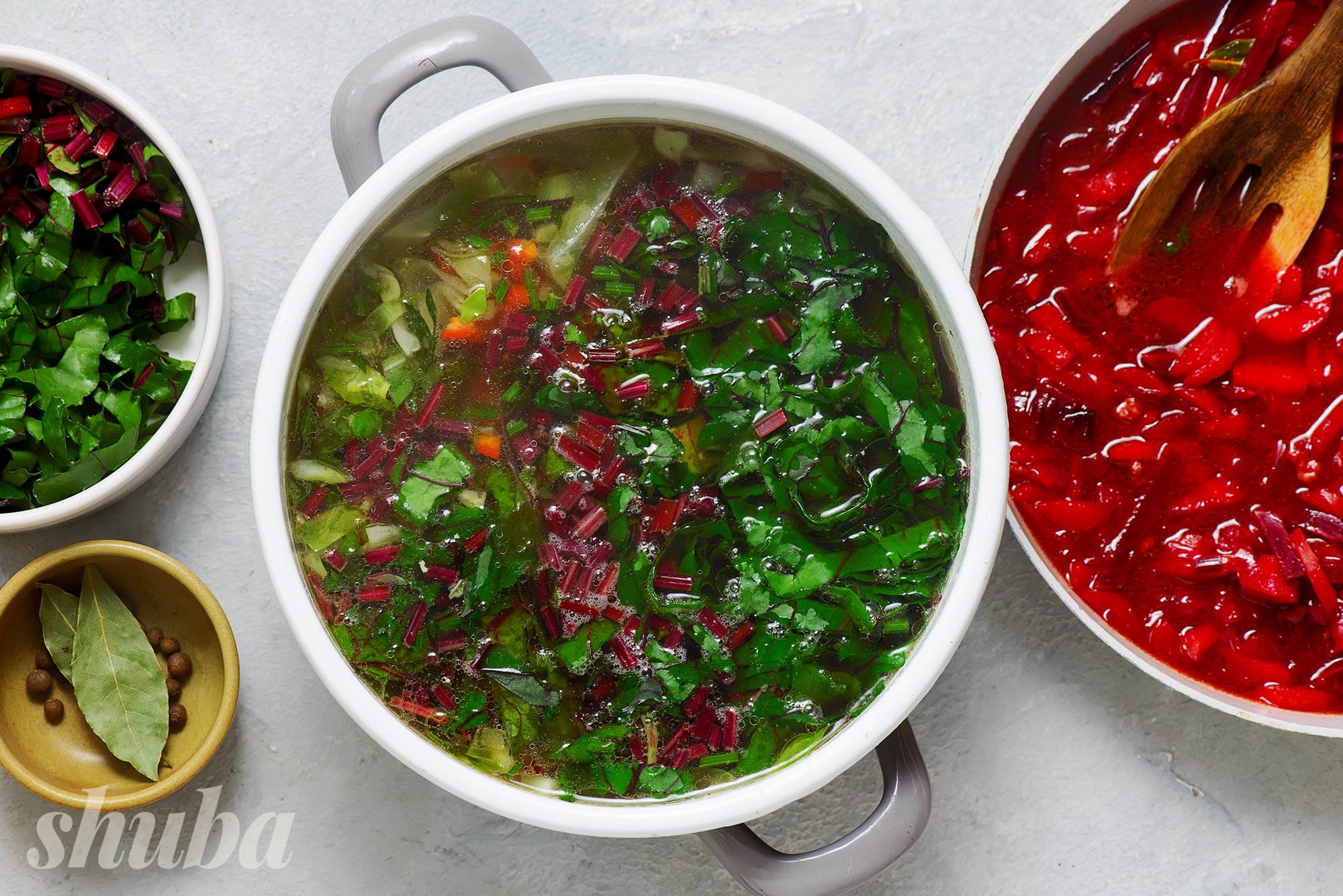 Заливаємо яловичину холодною водою, доводимо до кипіння, знімаємо шум, додаємо лавровий лист і духмяний перець. Варимо на слабкому вогні 2–2,5 години, потім м’ясо виймаємо, а бульйон проціджуємо крізь сито. Поки вариться бульйон, миємо й чистимо овочі. Гичку молодих буряка і моркви не викидаємо, а теж добре промиваємо й обсушуємо.