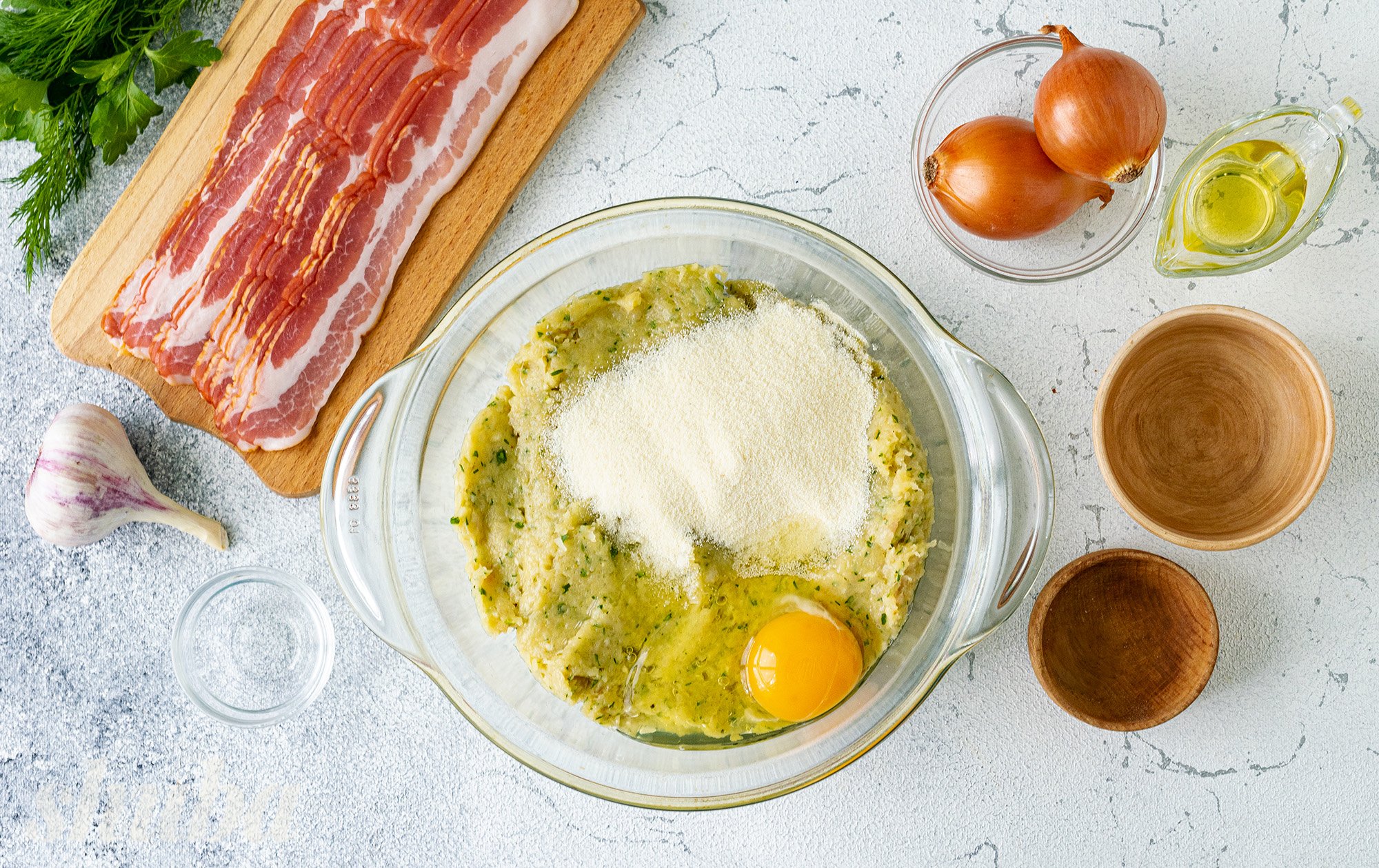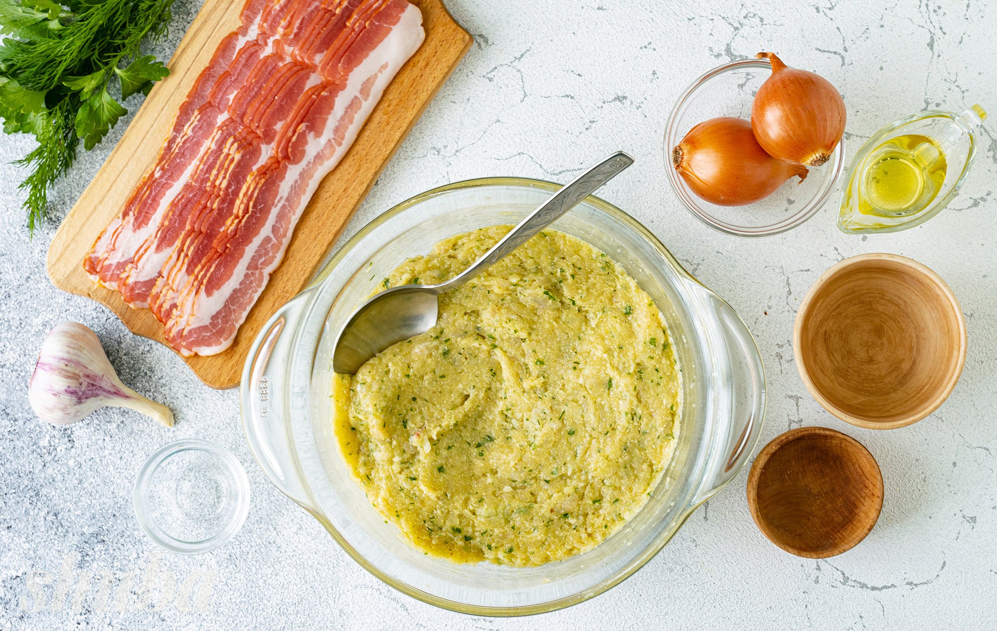 Для пишності та соковитості у фарш для курячих котлет у беконі додамо трохи манки. Після формування, а у нас буде 5-6 штук котлет, загорнемо кожну в смужку копченого або звичайного бекону та швидко запечемо в духовці. Тож апетитну страву тобі гарантовано!