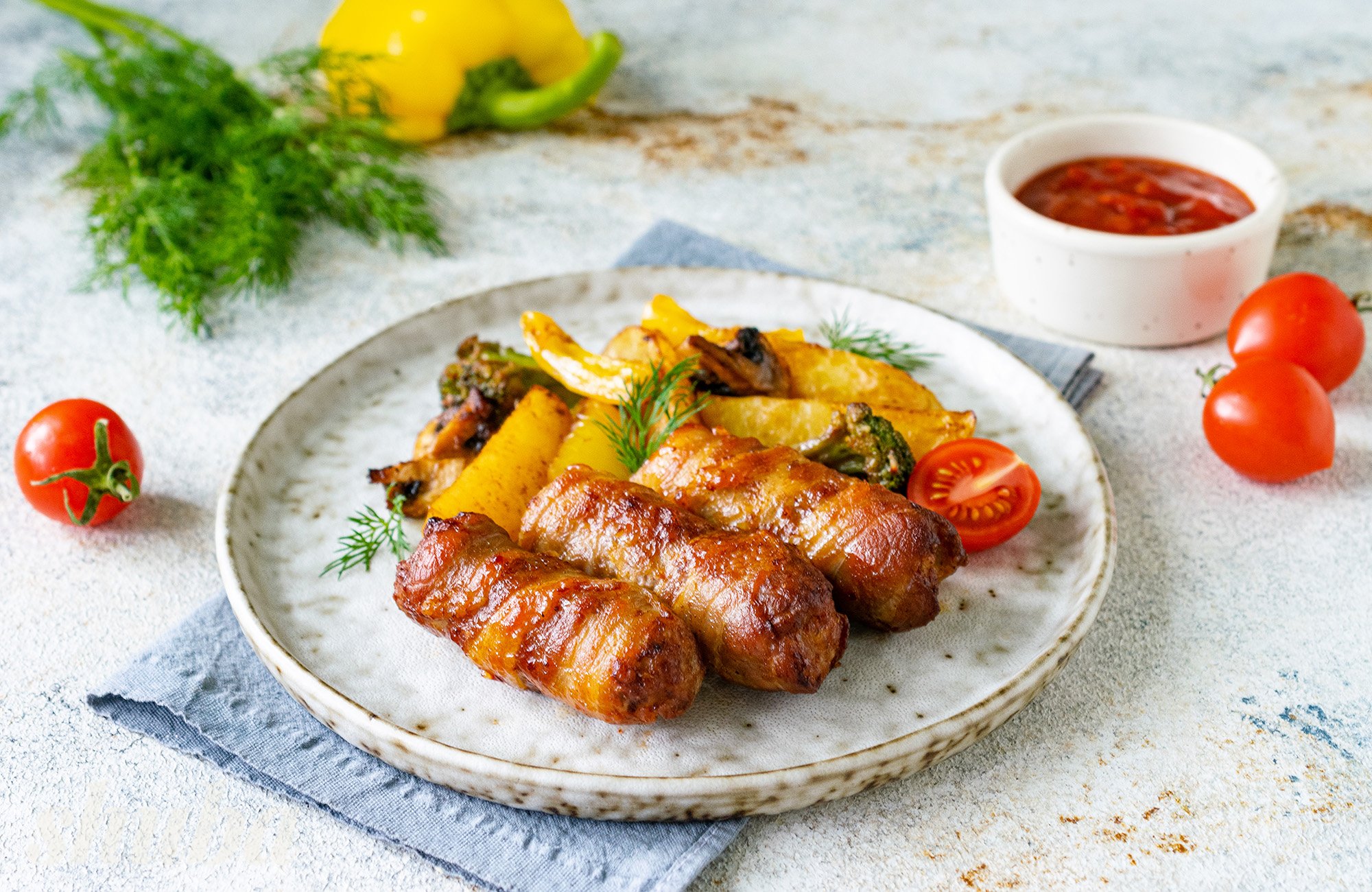 Неймовірно смачні та ароматні чевапчичі в беконі подавай разом з овочами одразу після приготування, поки страва гаряча. Чудовим доповненням стане улюблений соус до м’яса.