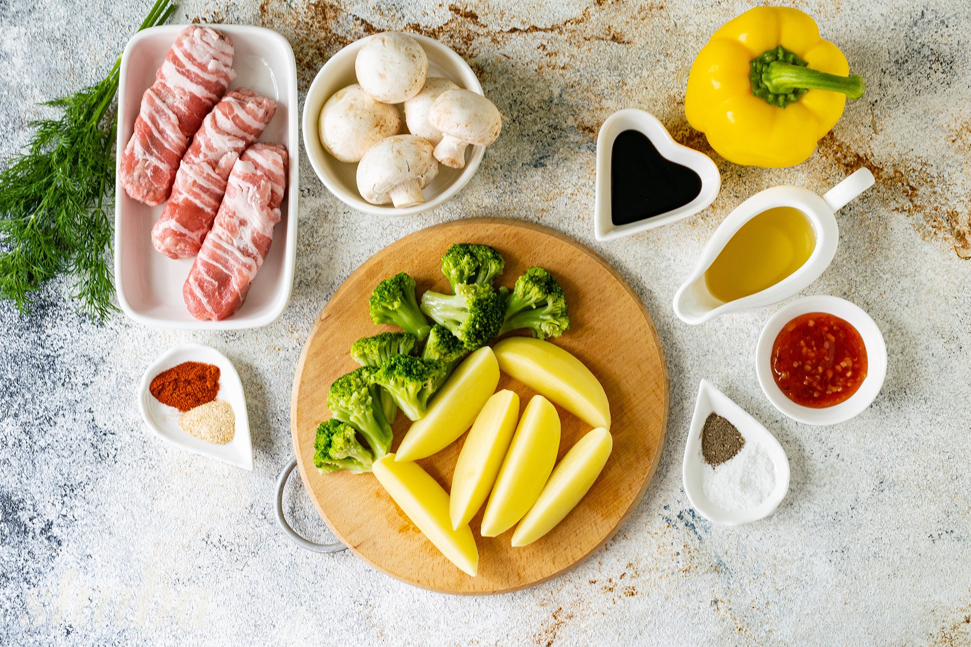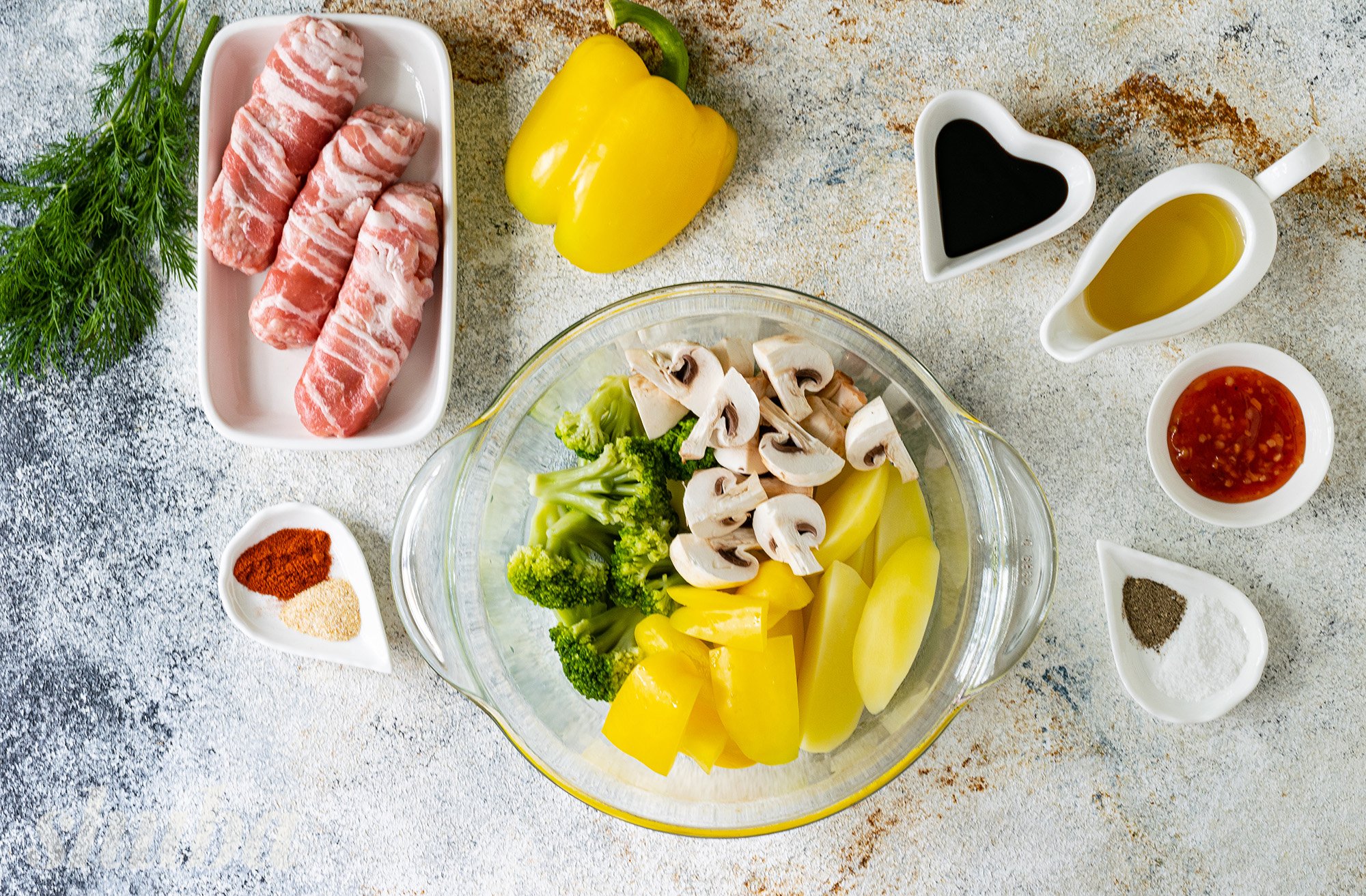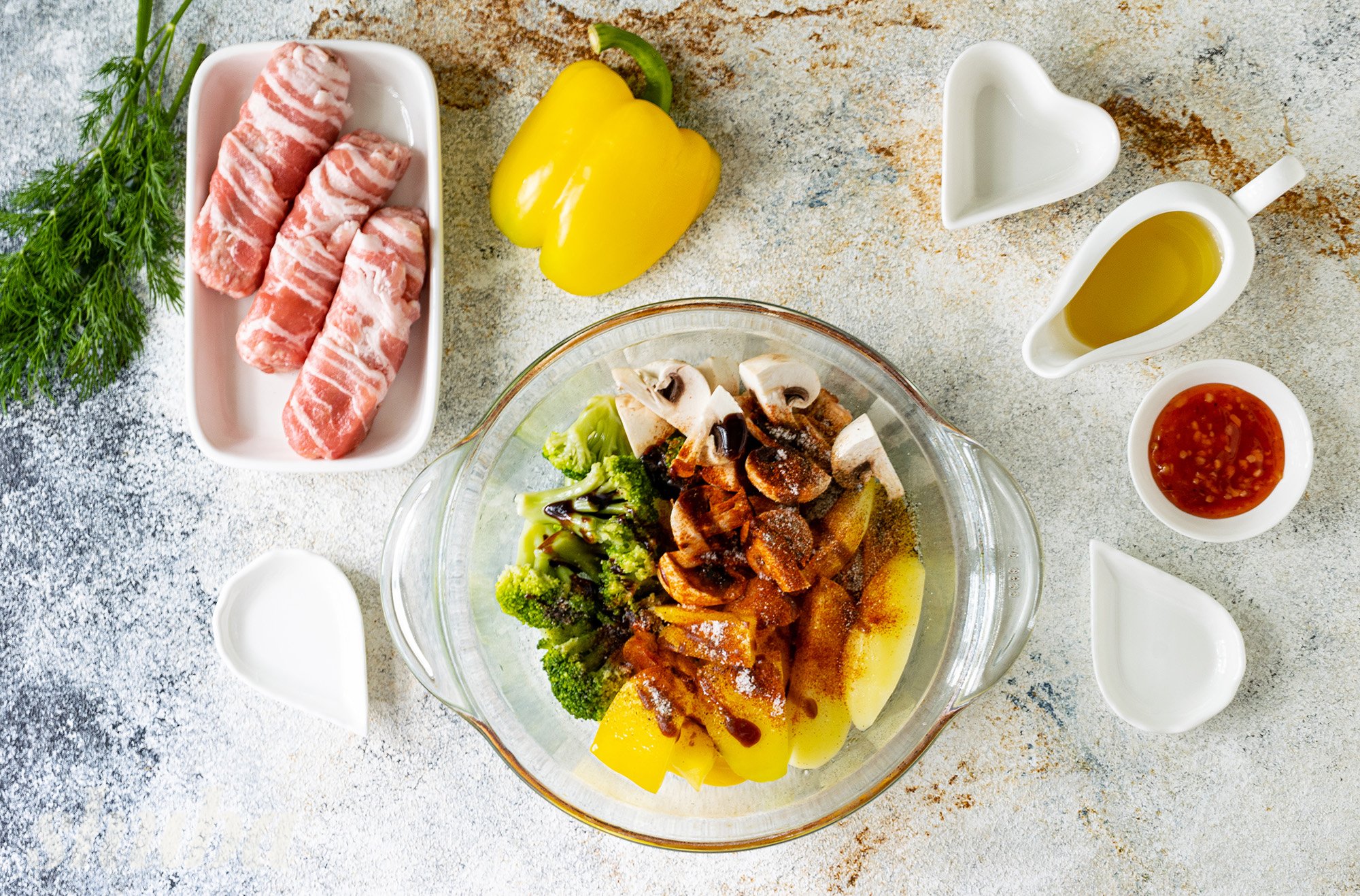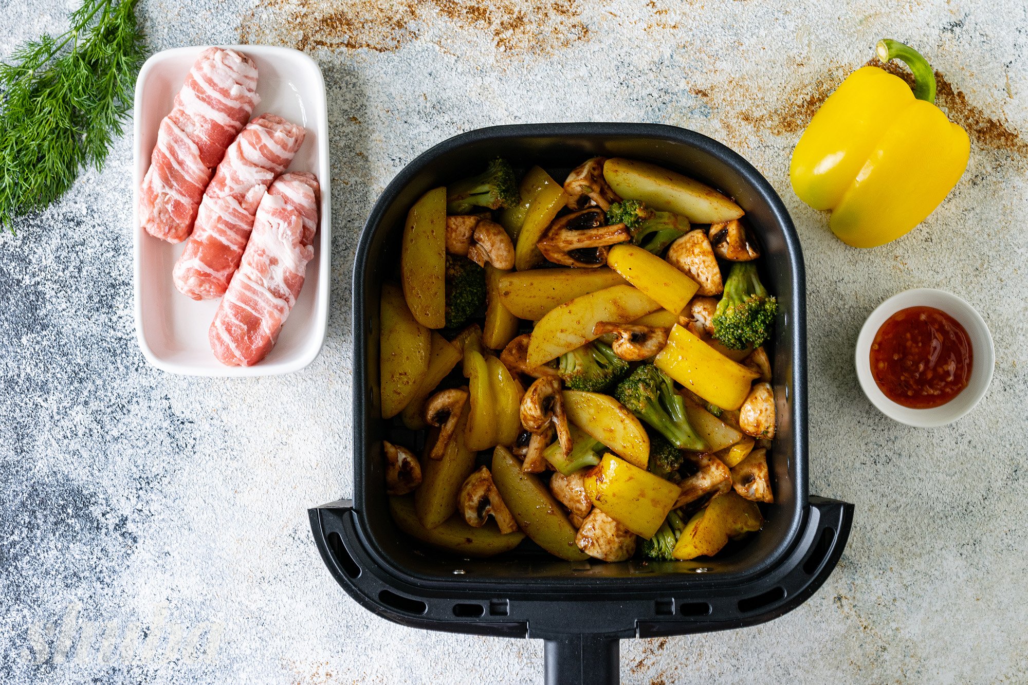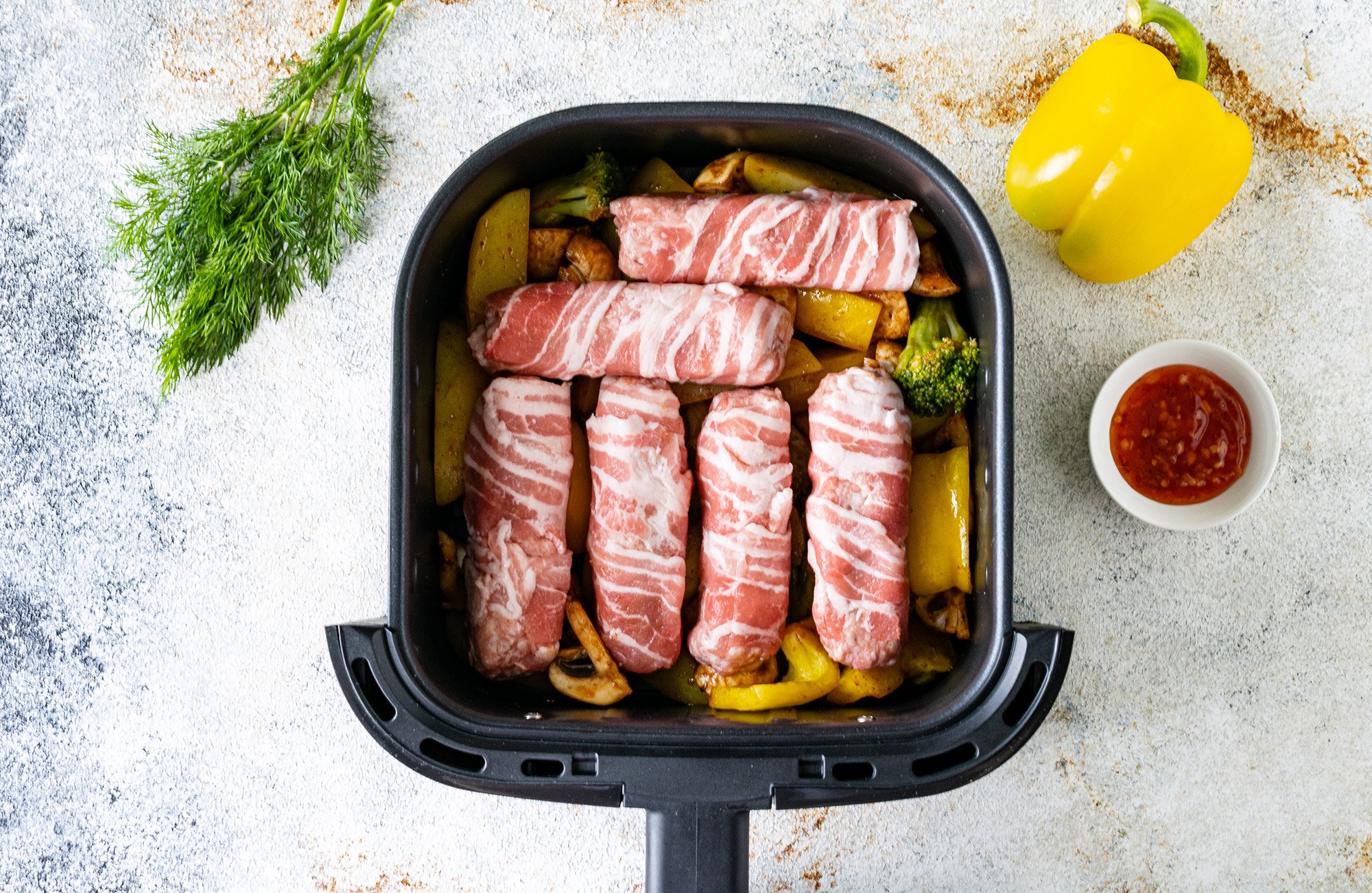 Сьогодні пропоную запекти чевапчичі в беконі разом з овочами та грибами в аерогрилі. Таким чином у нас вийде найсмачніша повноцінна страва — і м’ясо, і гарнір до нього. Завдяки бекону ковбаски виходять неймовірно соковитими, ніжними та м’якими. Спеції надають страві неймовірного смаку та аромату. Лише за пів години виходить смачна та корисна вечеря для всієї родини. Неодмінно спробуй!