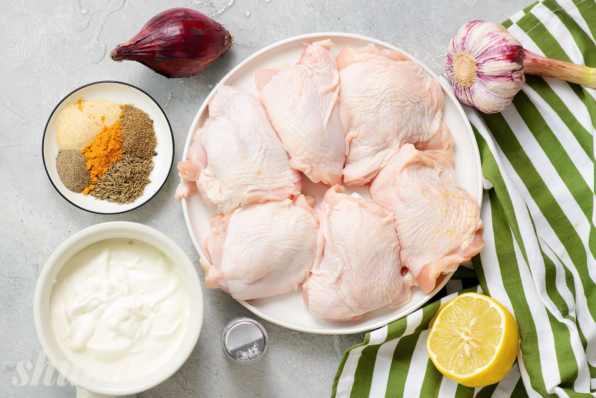 Для цього рецепта найкраще підійдуть курячі стегна без кістки — вони залишаються соковитими навіть після запікання. Йогурт обирай густий, без добавок. Лимон додасть легку кислинку, а куркума — приємний золотистий колір.