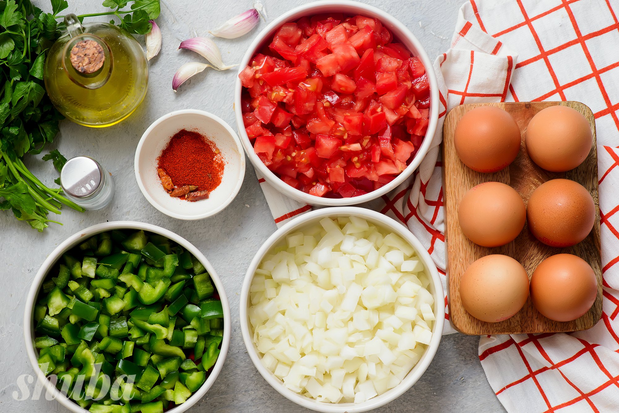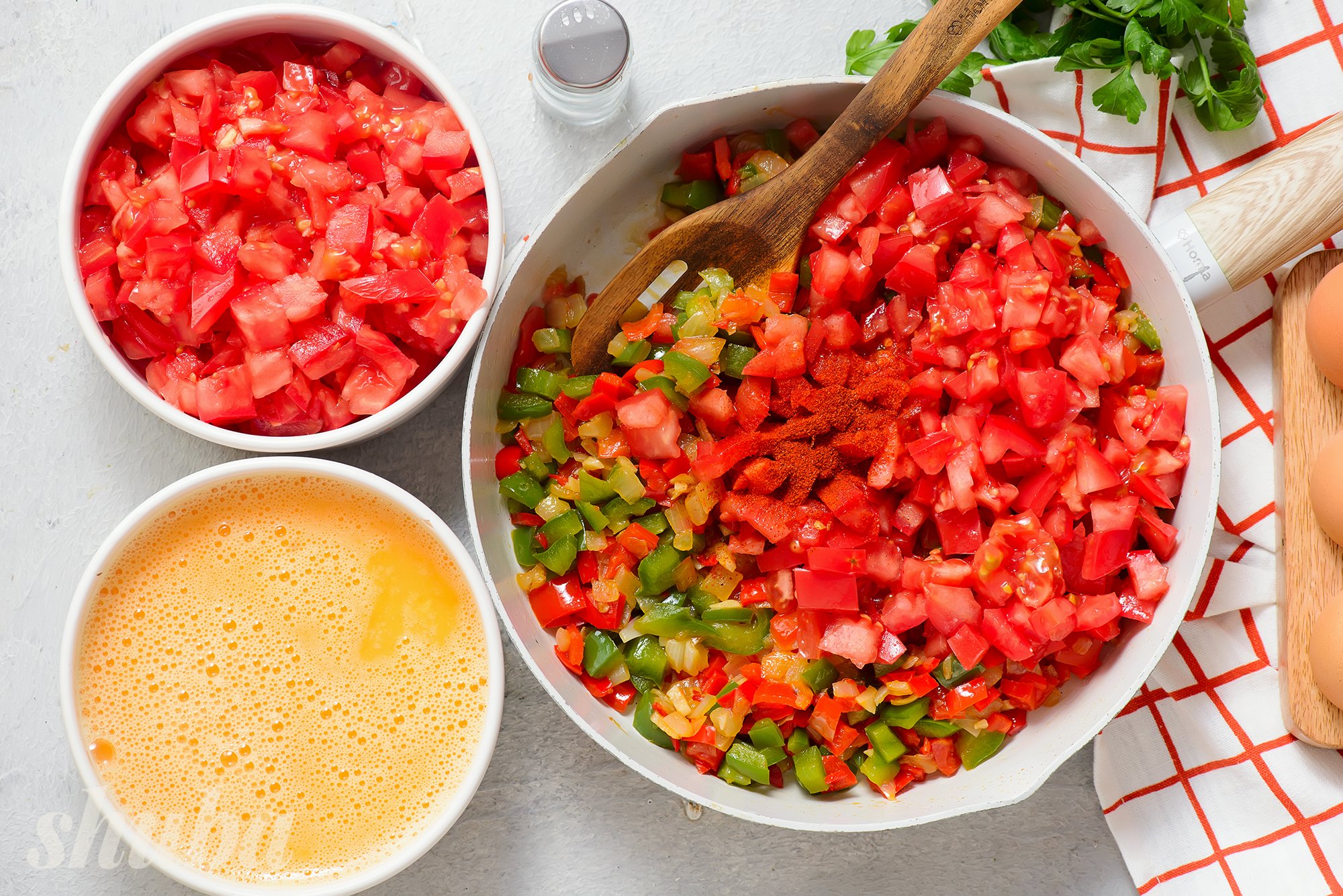 В цій яєчні використовується поєднання свіжих помідорів та томатної пасти. Тож вона має особливо насичений помідорний смак.