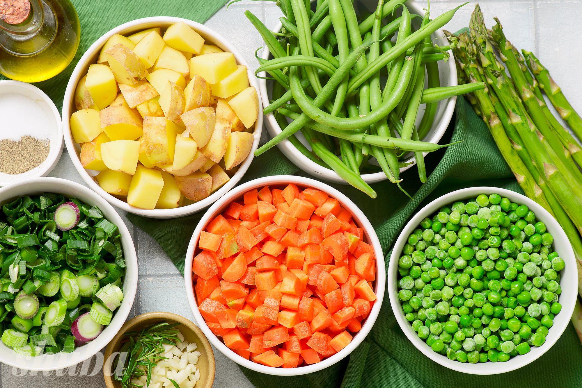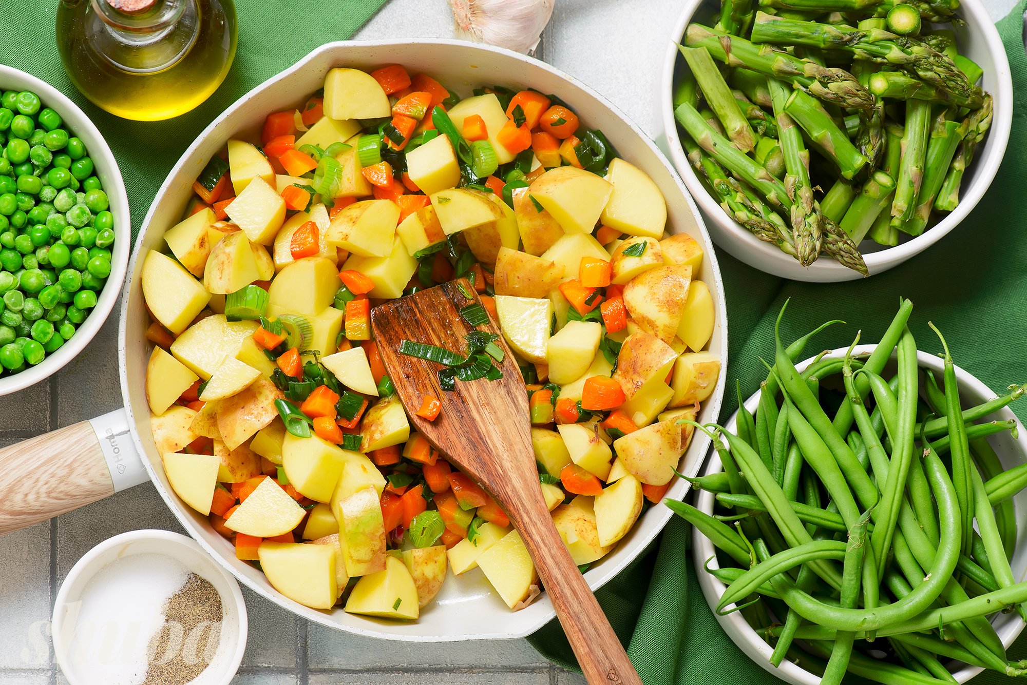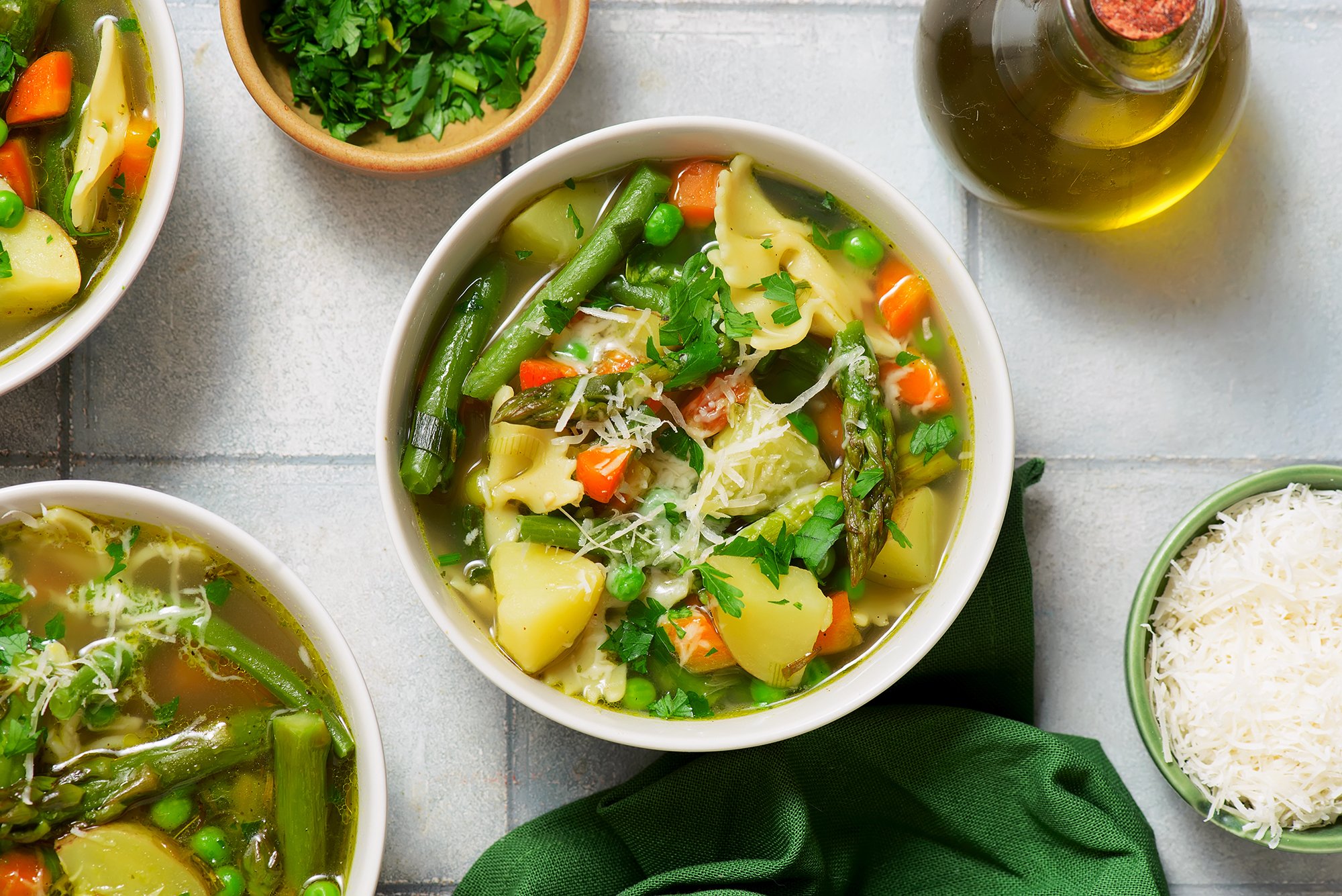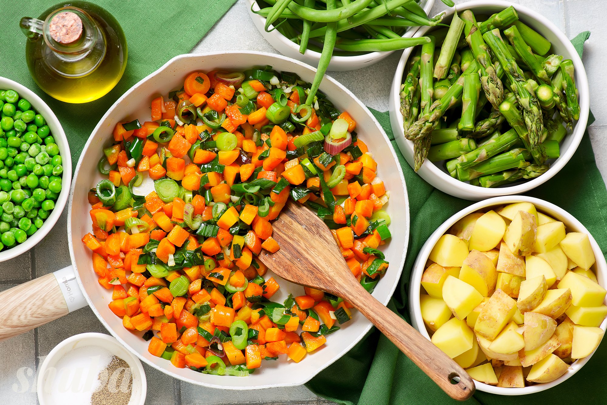 - В цьому рецепті використовуються молоді овочі — морква, картопля, горошок, спаржа. Молоді овочі більш ніжні й швидше готуються, тож важливо їх не переварити.