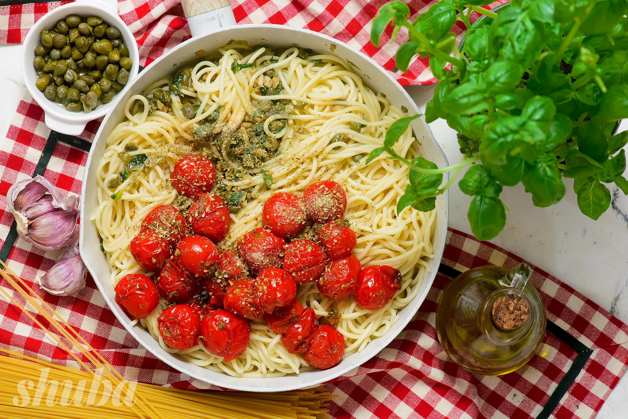 Помий помідори та базилік, почисть часник. Відміряй спеції, каперси, макарони та олію. Постав воду для пасти на вогонь і розігрій духовку до 200°C.