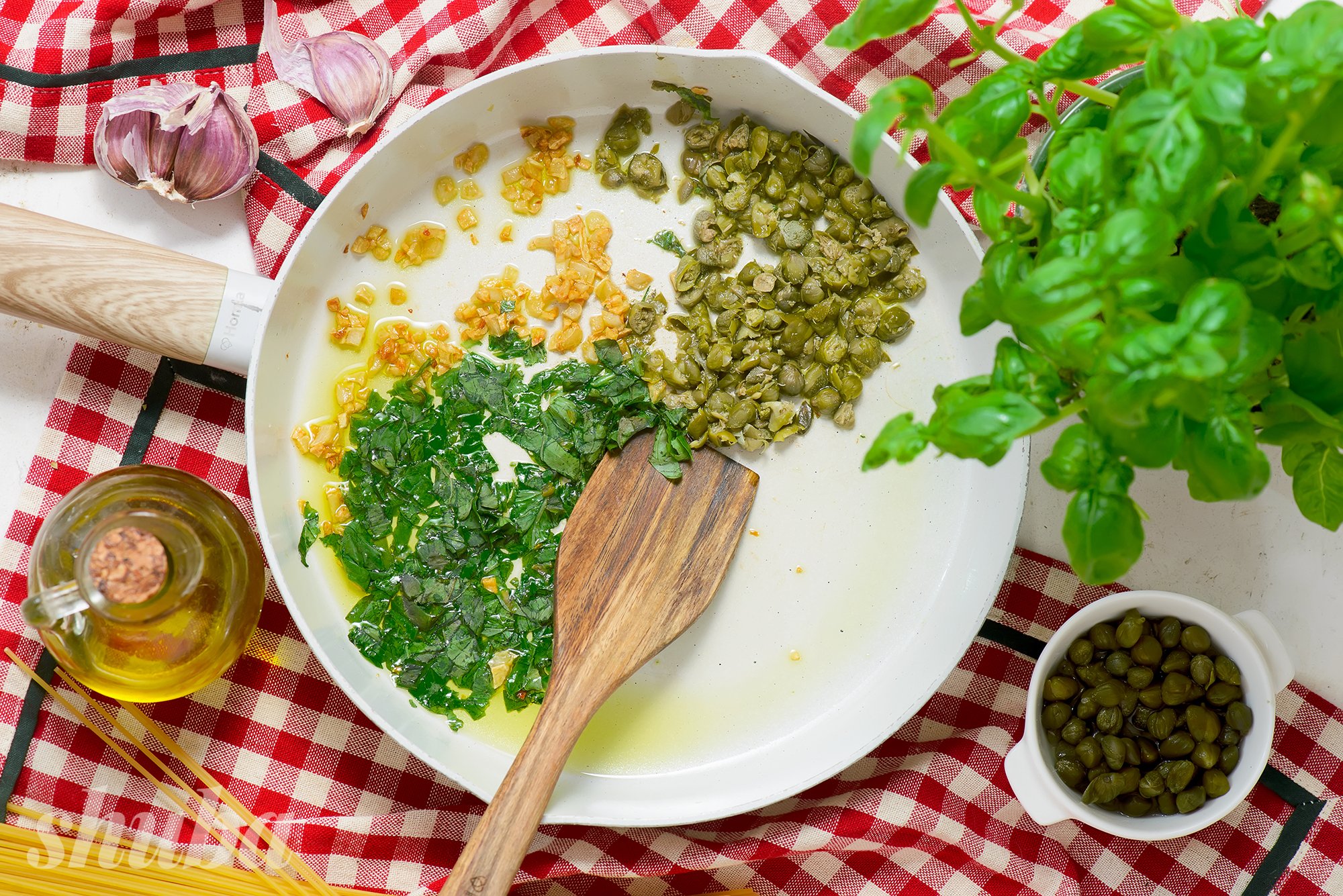 На сковороді розігрій 20 мл олії. Додай подрібнений часник, каперси та нарізаний базилік. Обсмажуй 2–3 хвилини на середньому вогні — часник має підрум’янитися.