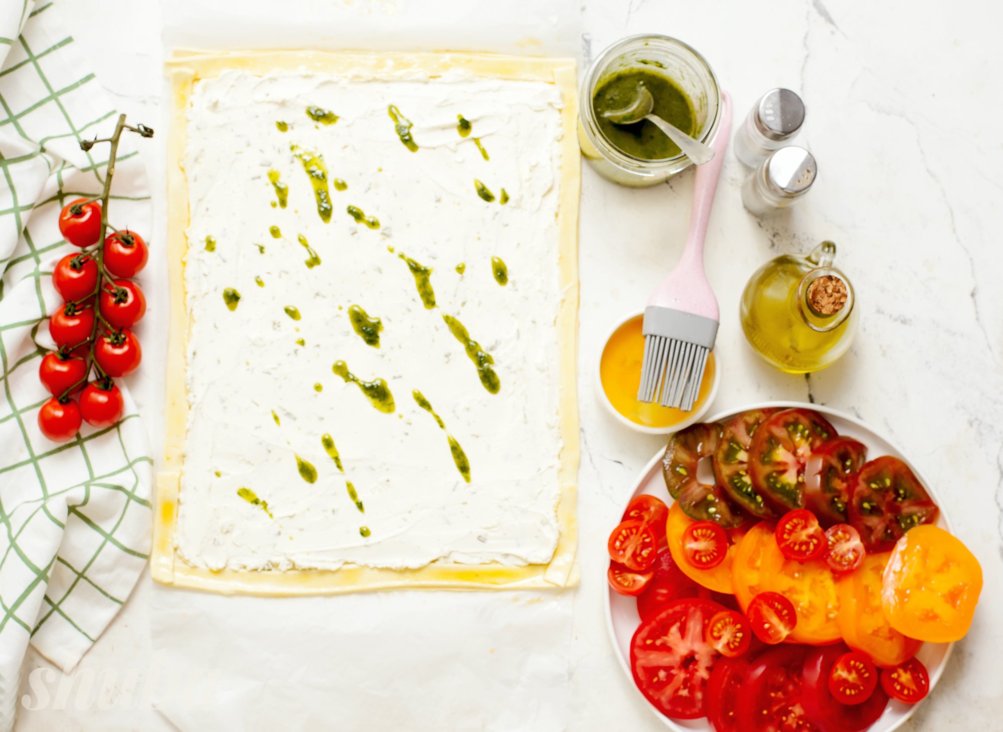 Тарт з томатами і крем-сиром — це овочева випічка на основі готового листкового тіста з кремовим шаром на основі вершкового сиру та із запеченими помідорами. Рецепт цього відкритого пирога з томатами є прикладом простої літньої страви з використанням сезонних овочів. Вона не потребує складного процесу приготування.