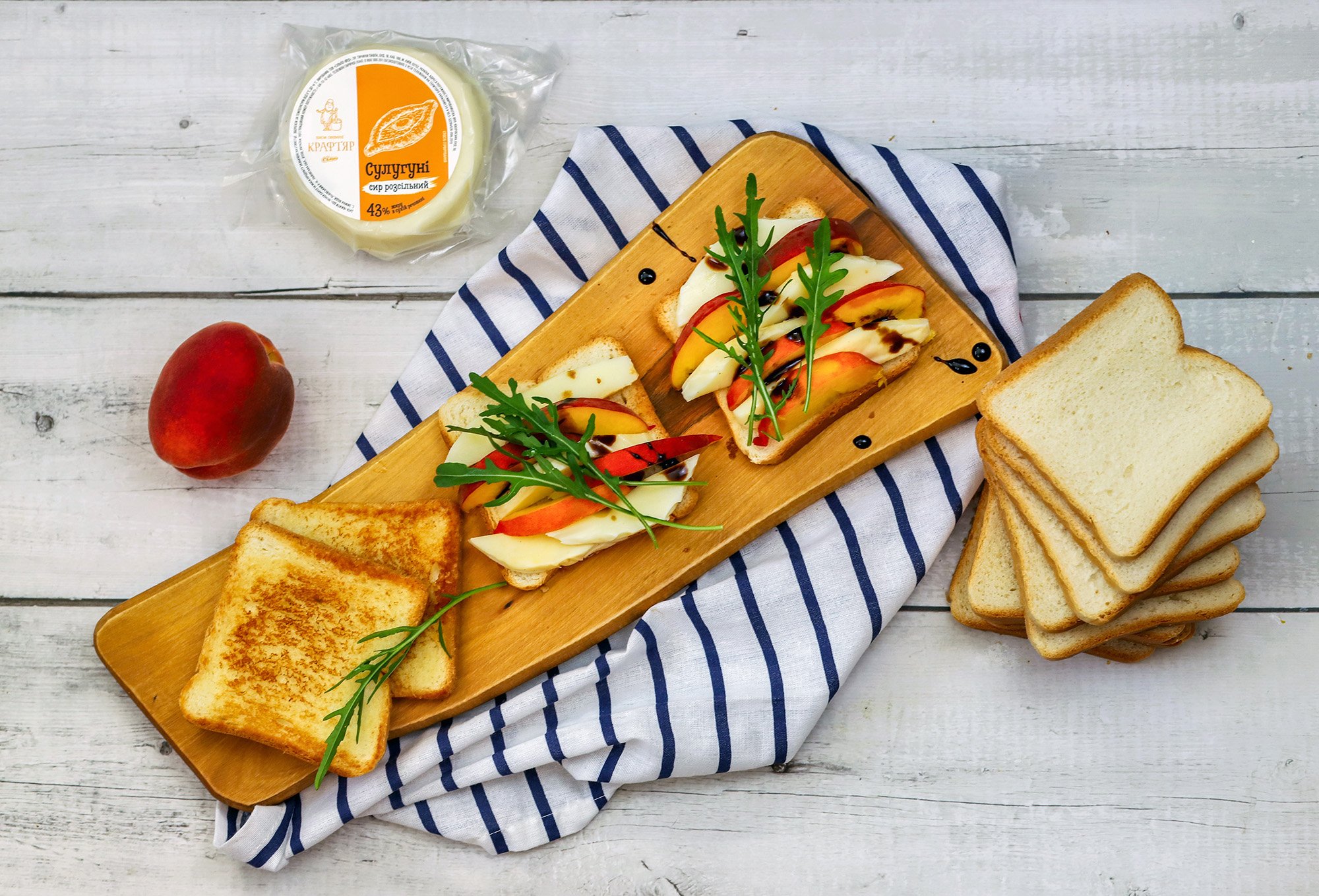 На обсмажену скоринку двох скибок виклади сир сулугуні, скибочки персика та руколу й полий бальзамічним кремом. Накрий сендвіч хлібом, смаженою стороною до начинки.