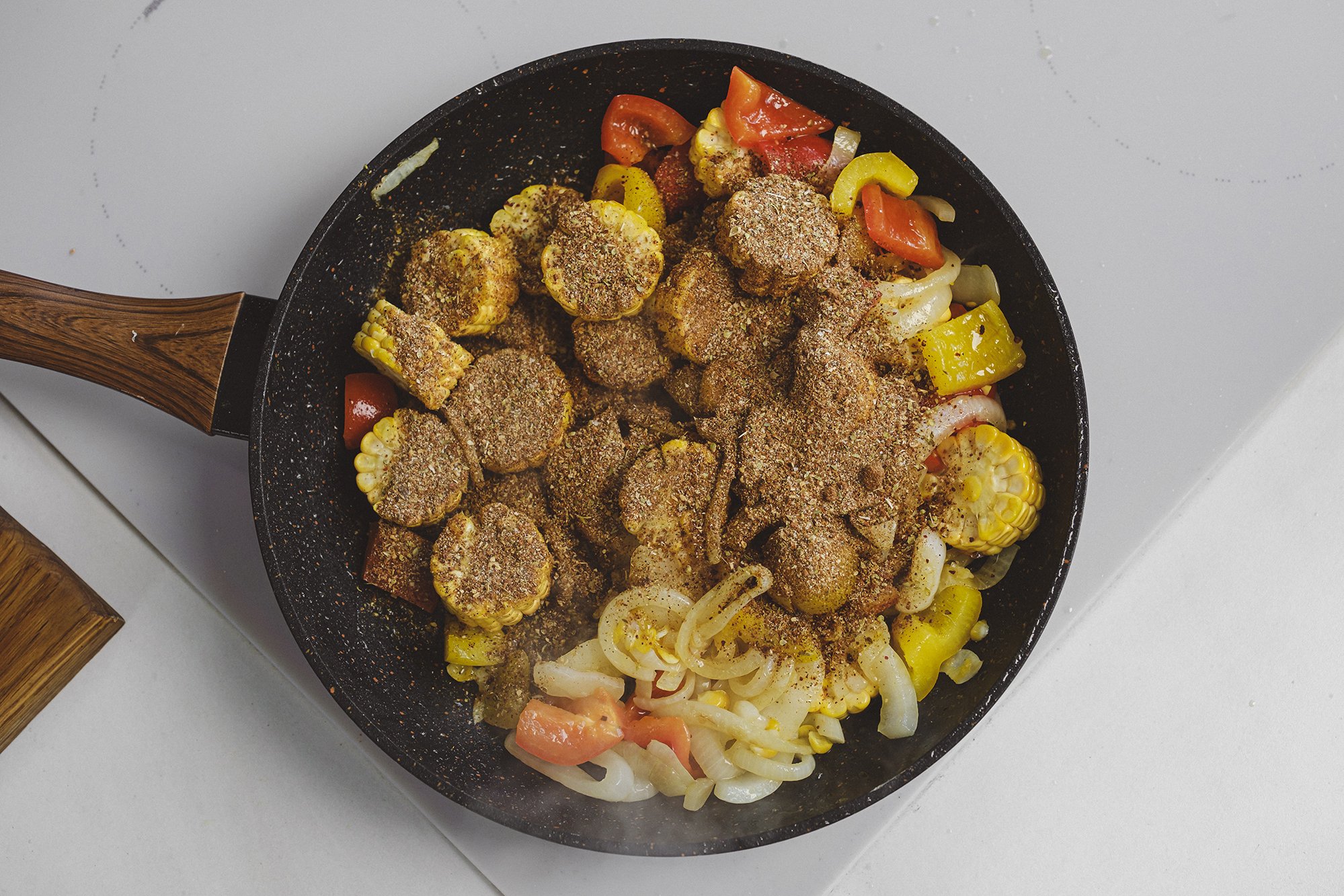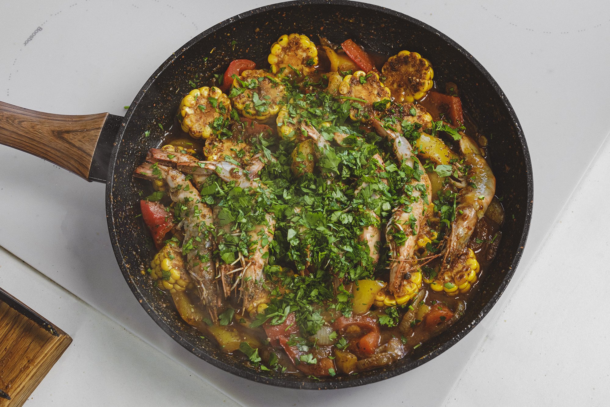 Креветки з кукурудзою в каджунському стилі — це страва, де прості інгредієнти розкриваються за допомогою спецій каджун. Комбінація креветок, овочів та кукурудзи створює збалансований смак, а готується все на одній пательні.