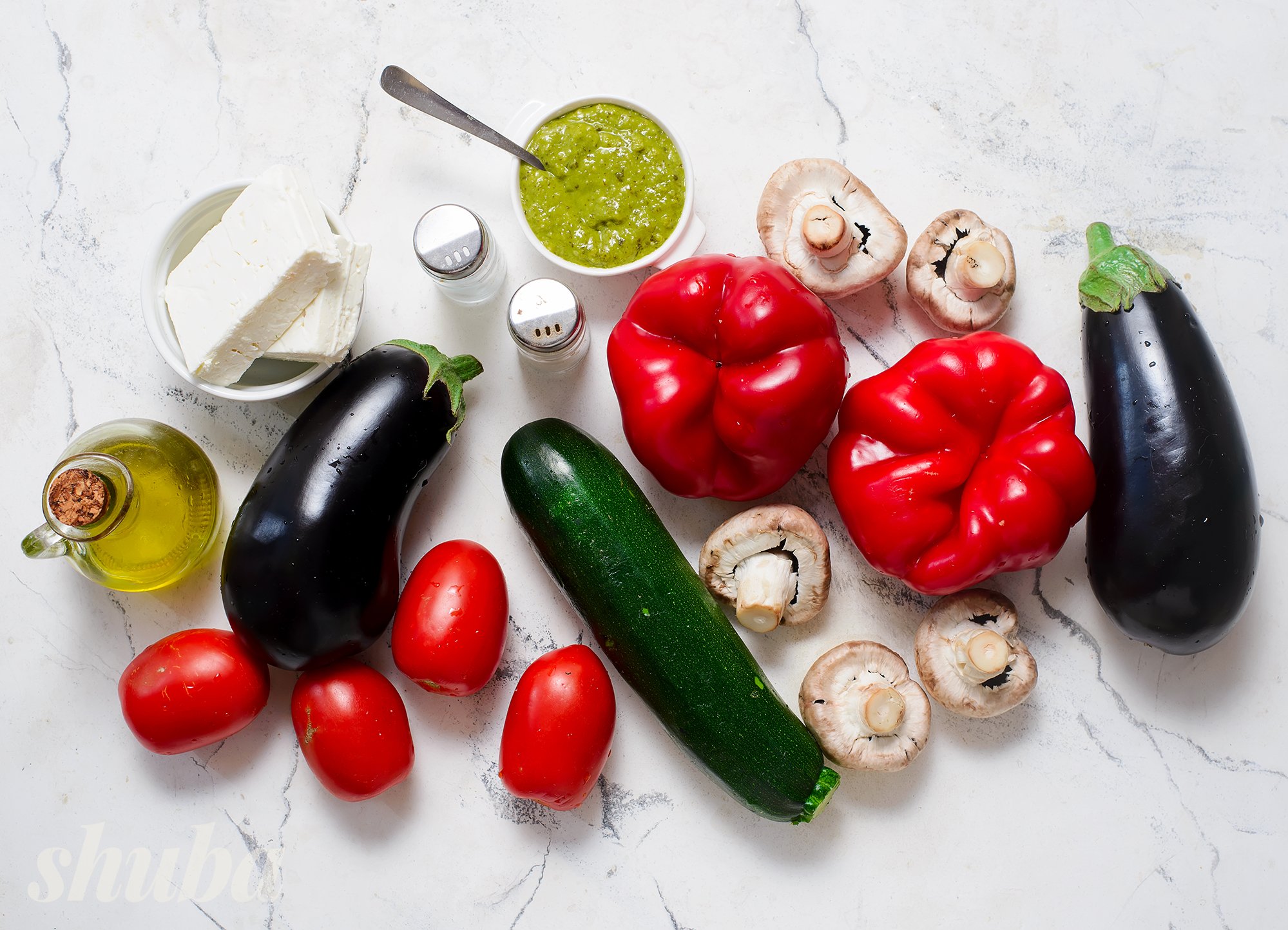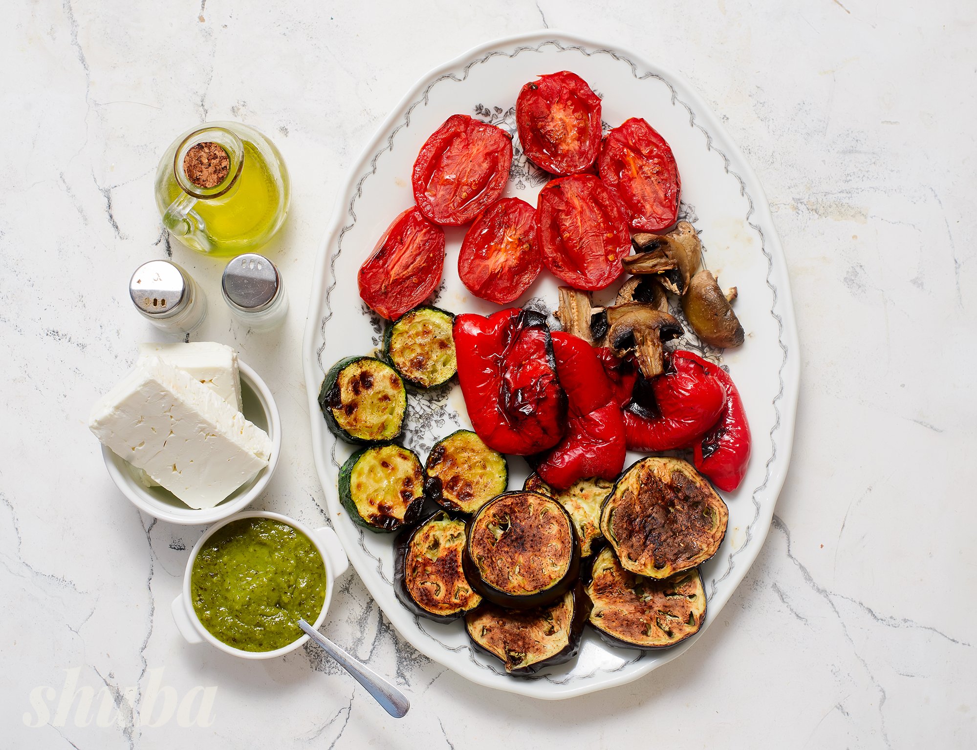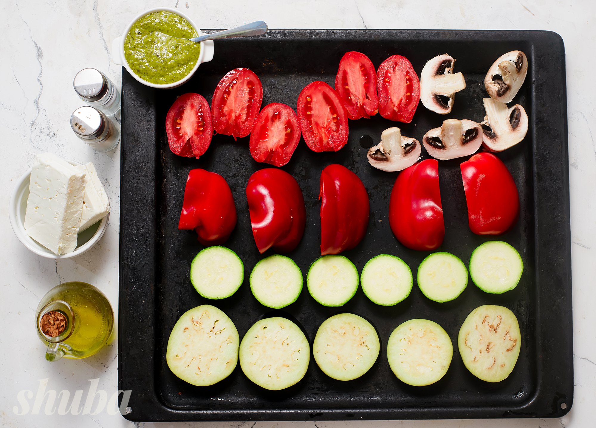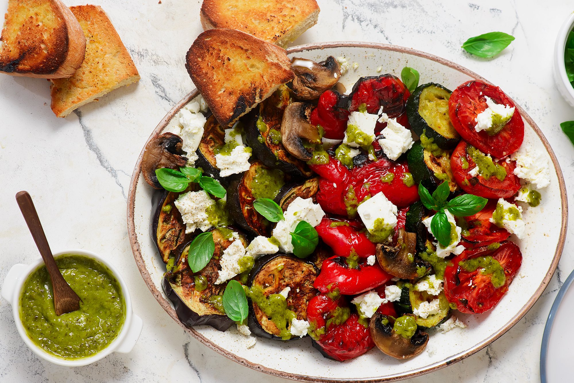 Салат із запечених овочів з фетою — це страва, де поєднуються баклажан, цукіні, болгарський перець, томати та гриби. Завдяки запіканню овочі отримують насичений смак, а фета та соус песто створюють баланс солоності й свіжості.