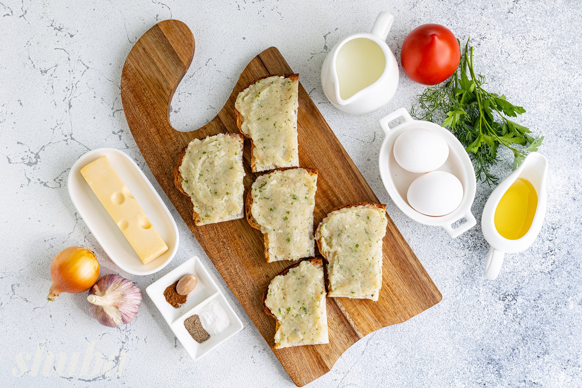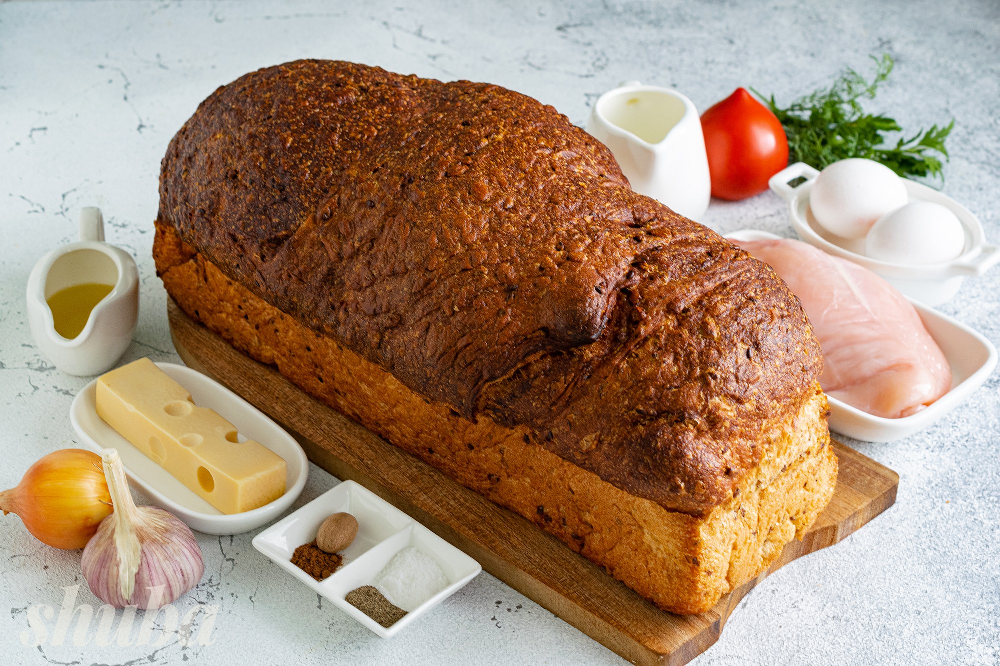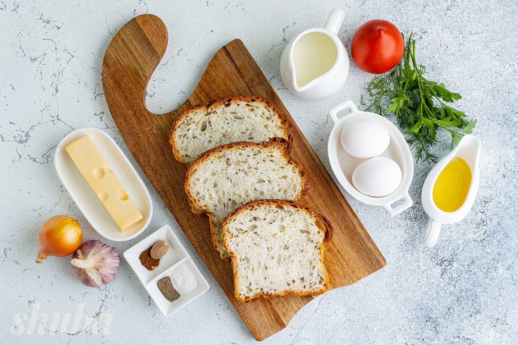 Для страви зручно використовувати прямокутний хліб. У нас це хліб «Скандинавський» з льоном та соняшниковим насінням, який можна купити в «Сільпо». Пористий, повітряний м'якуш цього хліба добре просочується м'ясними соками та яєчною заливкою.
