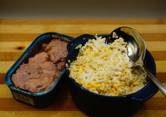 - яйця відварюємо та заправляємо олією від печінки;