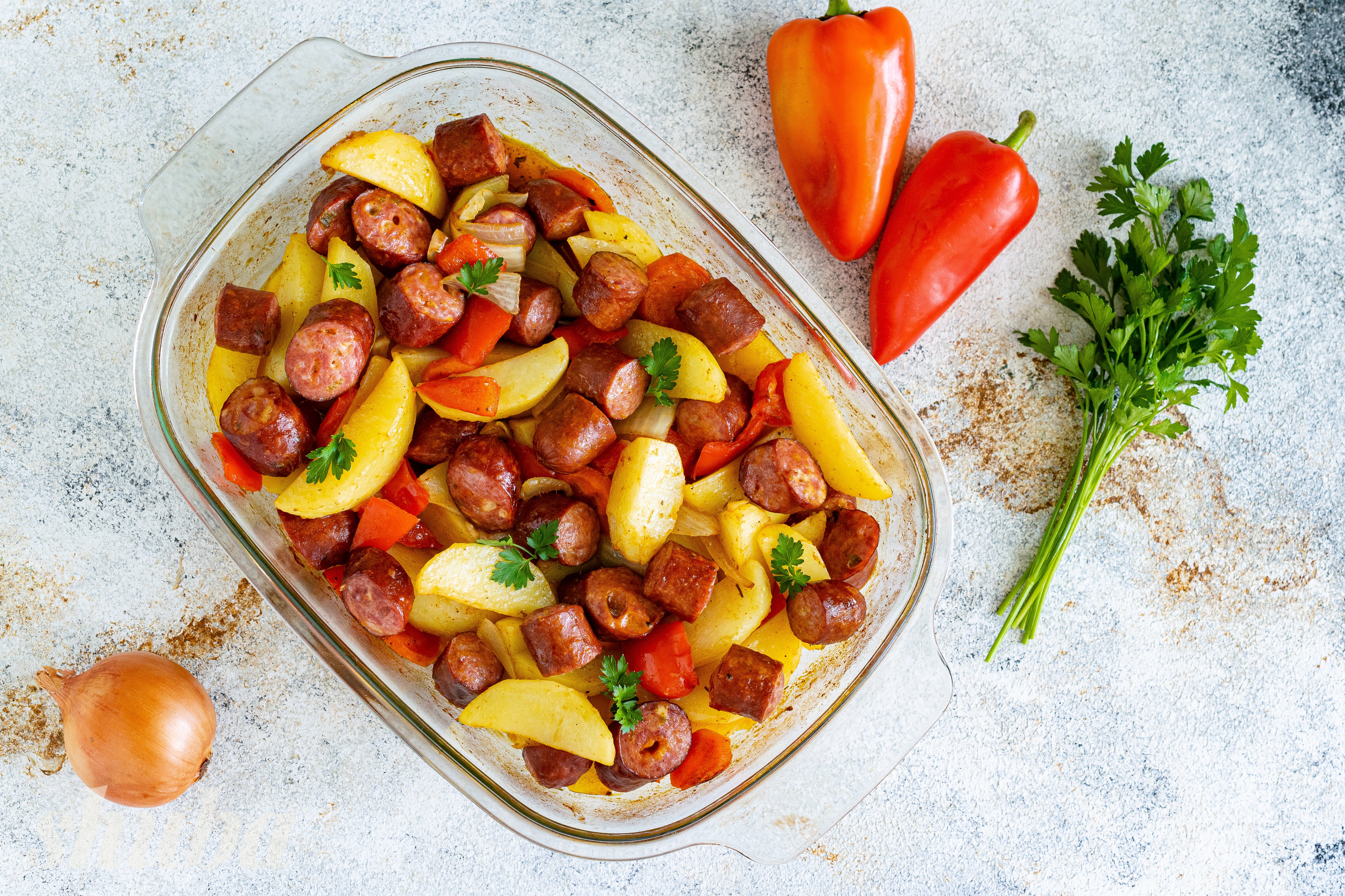 Уявіть собі ароматну, рум’яну страву прямо з духовки: золотисті скибочки картоплі з хрусткою скоринкою та ніжною серединкою, просочені соками та спеціями, та соковиті напівкопчені ковбаски, які наповнюють кухню апетитним запахом смаженого м’яса. На столі — справжня домашня їжа, ситна, смачна й проста, яка збирає всю родину разом.