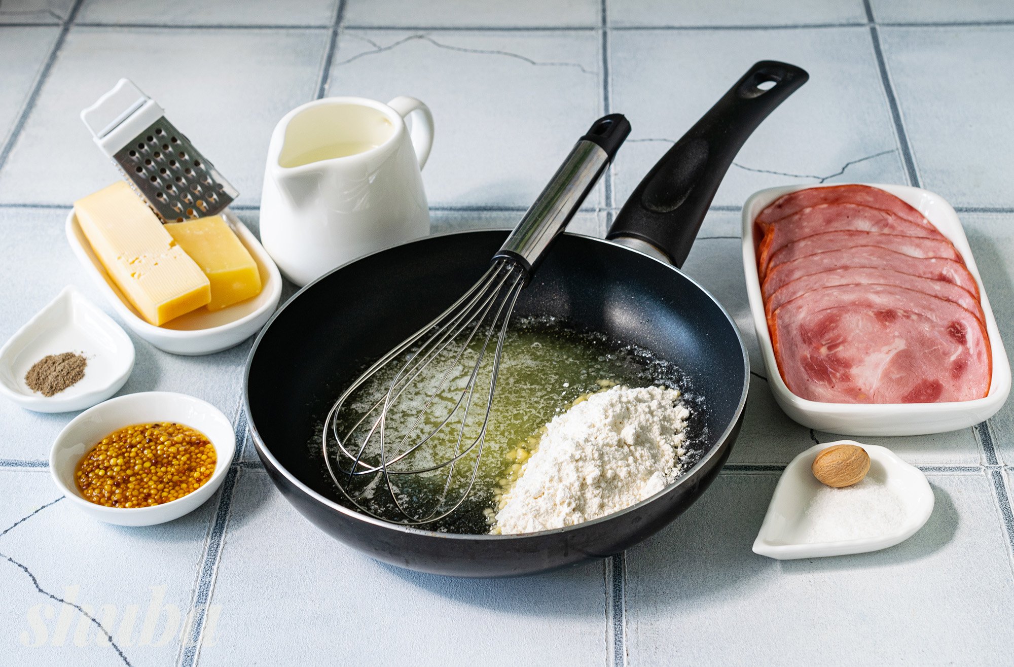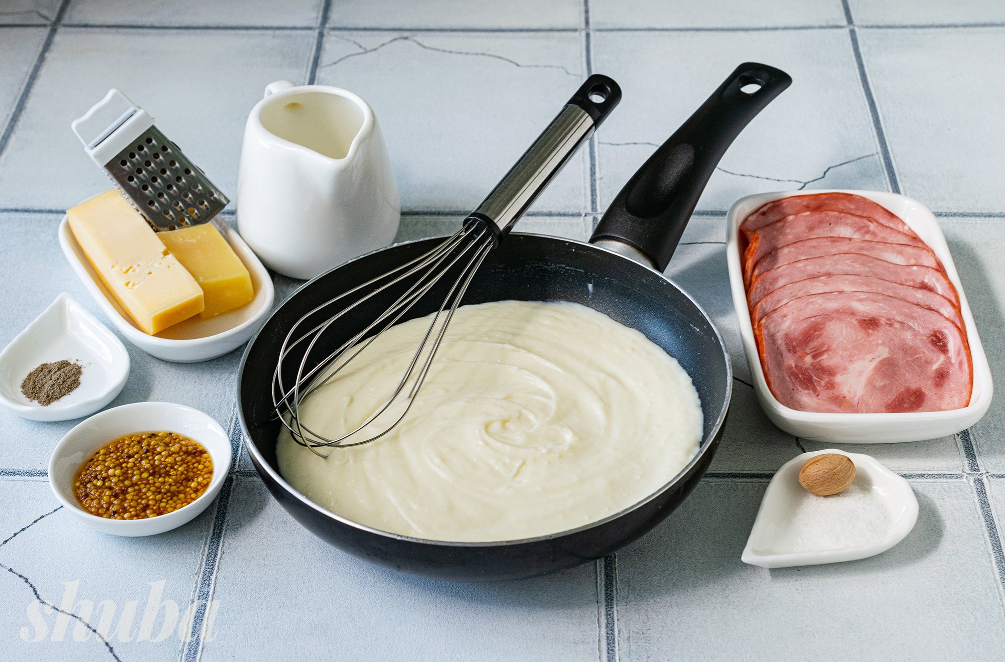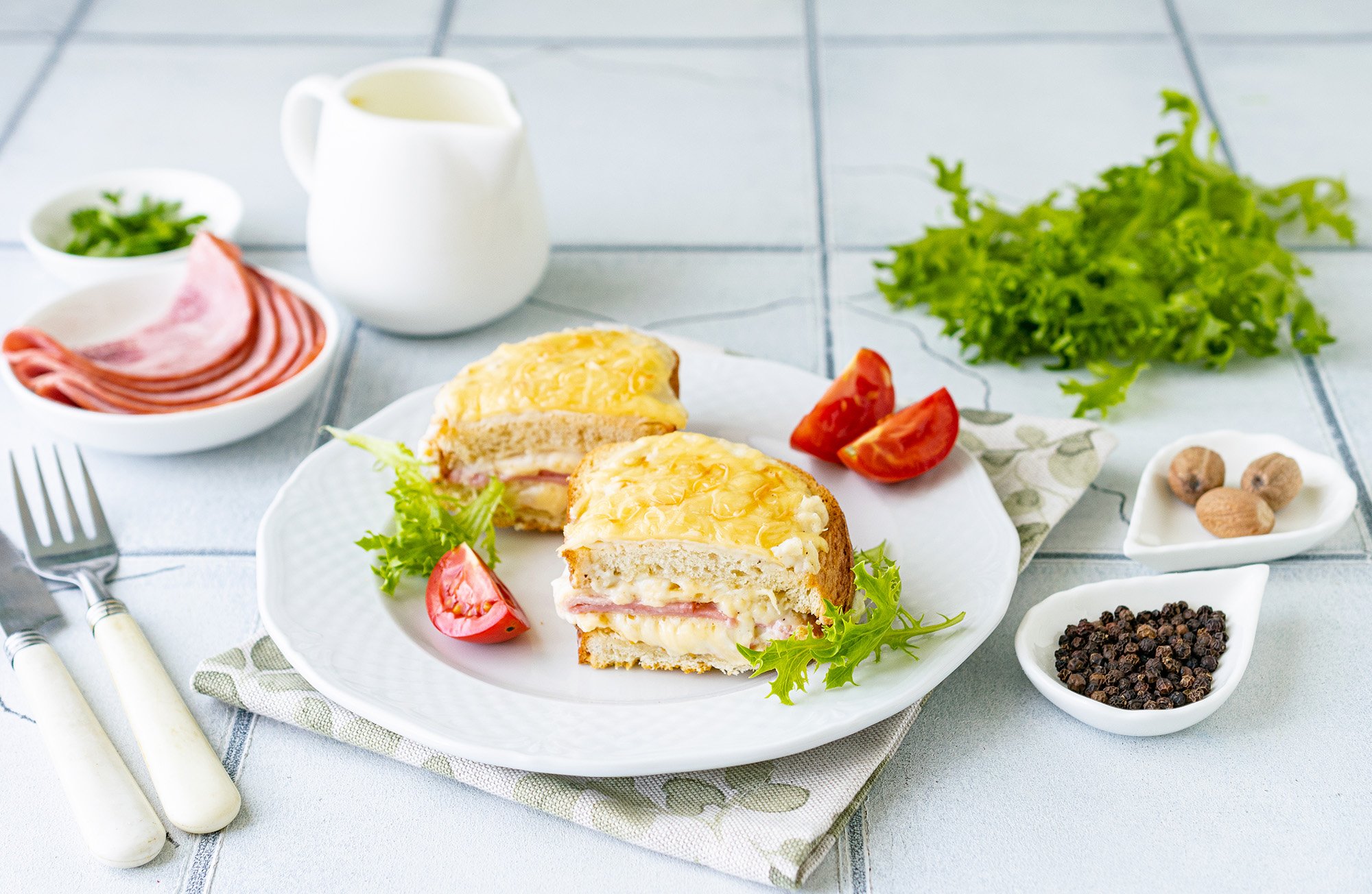У нашій версії крок-месьє ми використовуємо 4 тонкі шматочки (слайси) шинки, сири емменталь та пармезан. Додаємо і соус бешамель, який приправляємо мускатним горіхом для аромату.