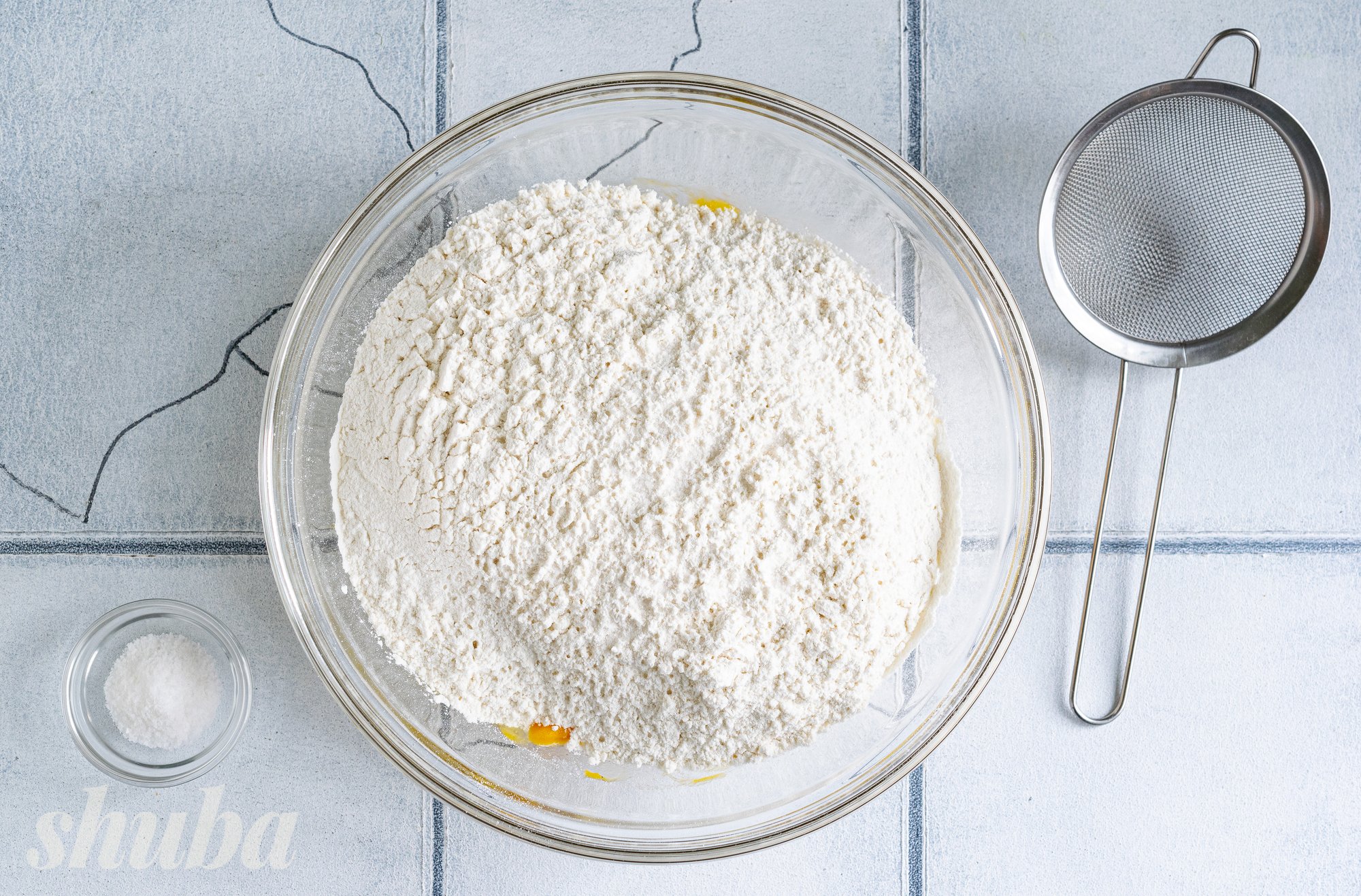 Введи в отриману суміш просіяне пшеничне борошно і сіль за смаком.