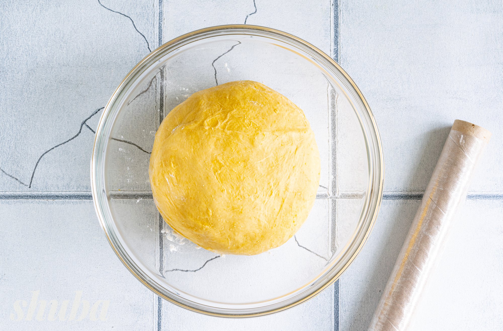 Перемішай інгредієнти до однорідної консистенції. У результаті має вийти м’яке та еластичне тісто. Загорни його в харчову плівку та залиш у холодильнику на 30 хвилин.