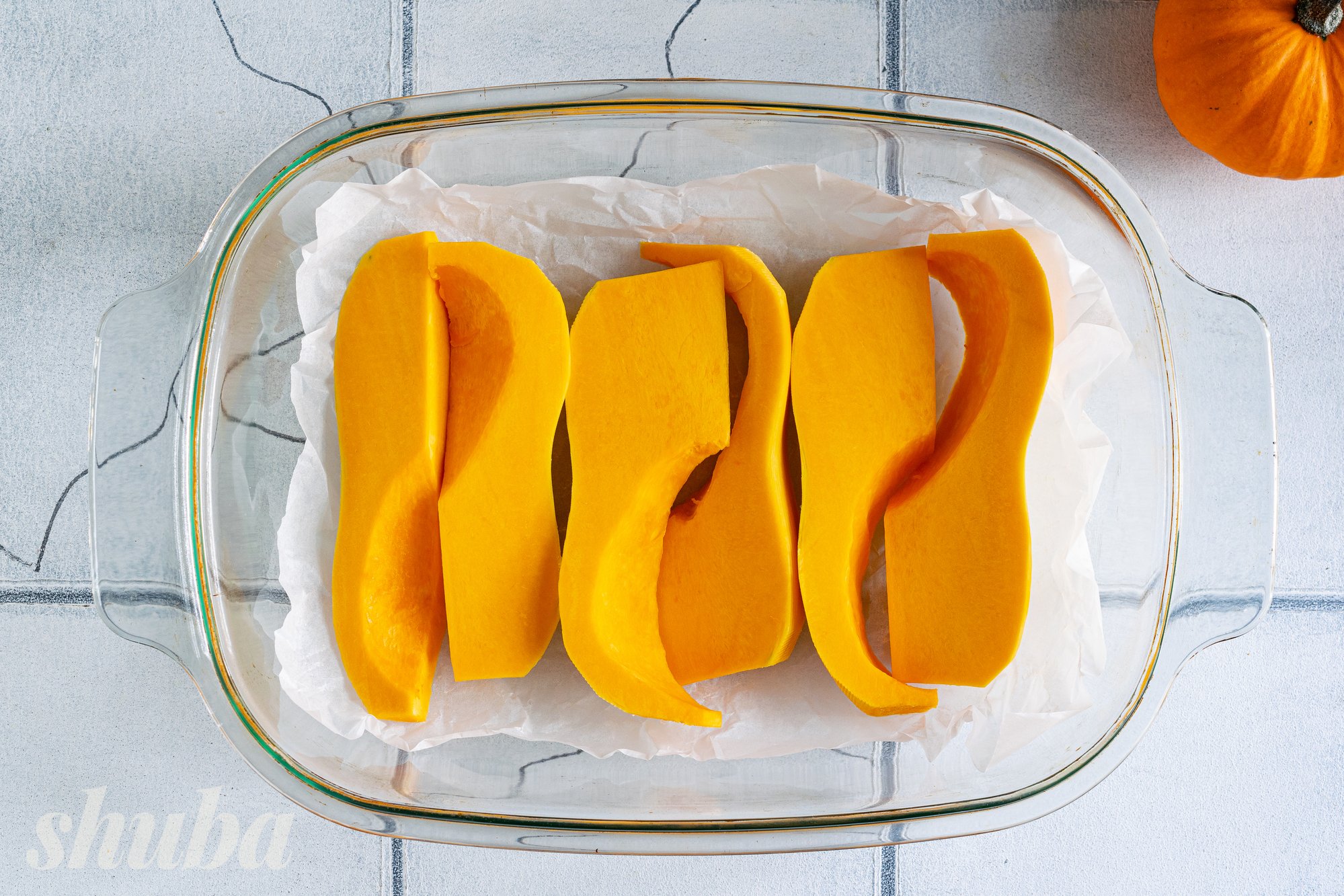 Очисти гарбуз від шкірки, розріж навпіл, видали серцевину з насінням. Наріж м’якоть гарбуза шматочками середнього розміру, виклади у форму для запікання, застелену пергаментом. Накрий форму кришкою або фольгою, відправ у розігріту до 180 °C духовку на 20-25 хвилин.