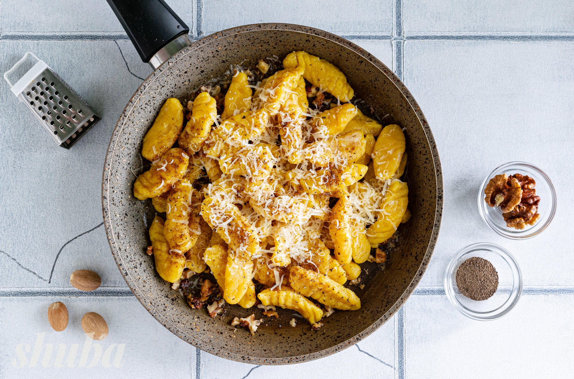 7/8. Змішай гарбузові ньокі з обсмаженими горіхами та сиром