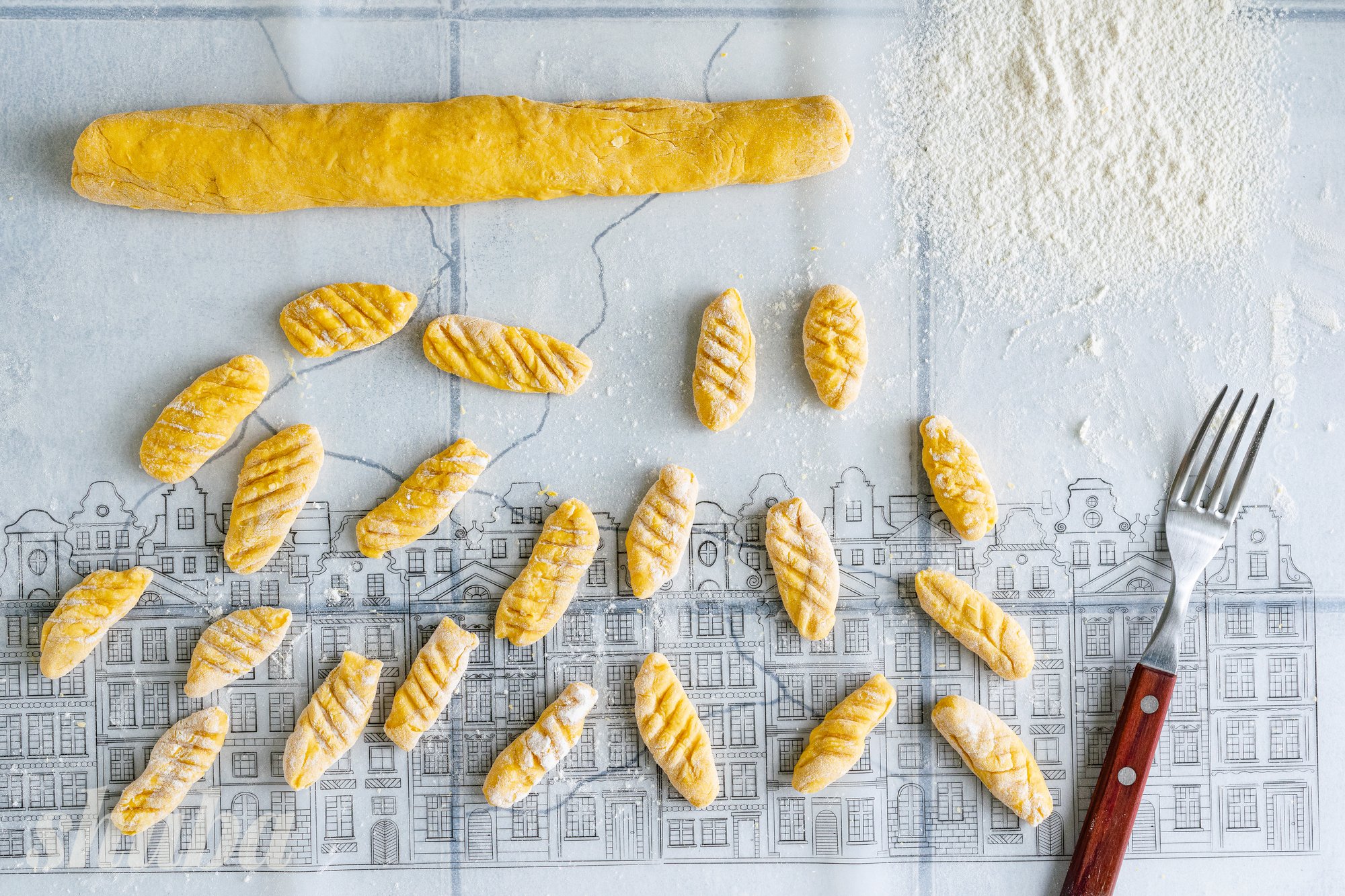 З готового тіста розкачай ковбаски, розріж їх на шматочки однакового розміру. Кожен шматочок тіста прокатай виделкою, щоб на ньому вийшли борозни. Це характерна форма для ньокі.