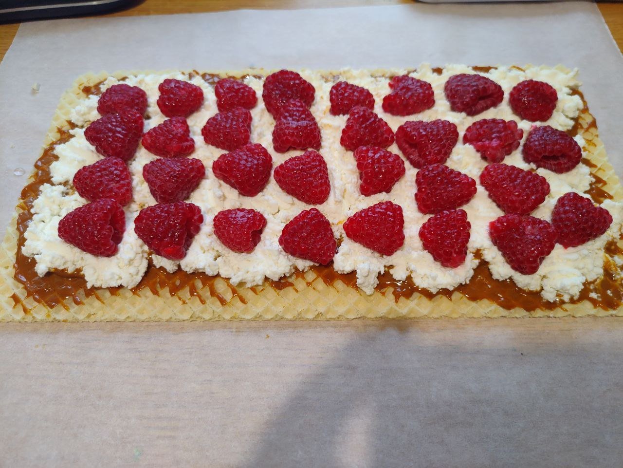 Готуємо вафельний торт з кисломолочним сиром та малиною