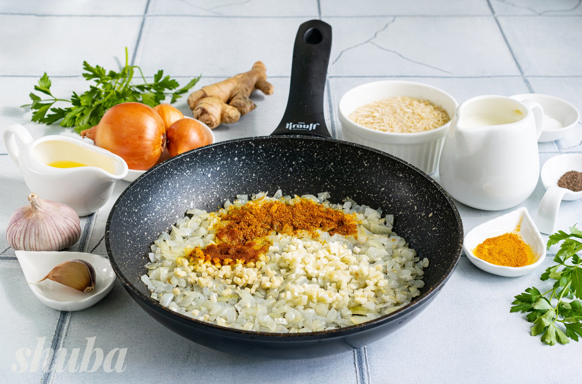 На сковороду з розігрітою оливковою олією виклади подрібнену цибулю. Помішуй та пасеруй овочі на середньому вогні до м’якості. Потім додай до цибулі часник та імбир. Всип порошок карі та половину меленої куркуми. Перемішай, продовжуй обсмажувати інгредієнти разом ще 1-2 хвилини.