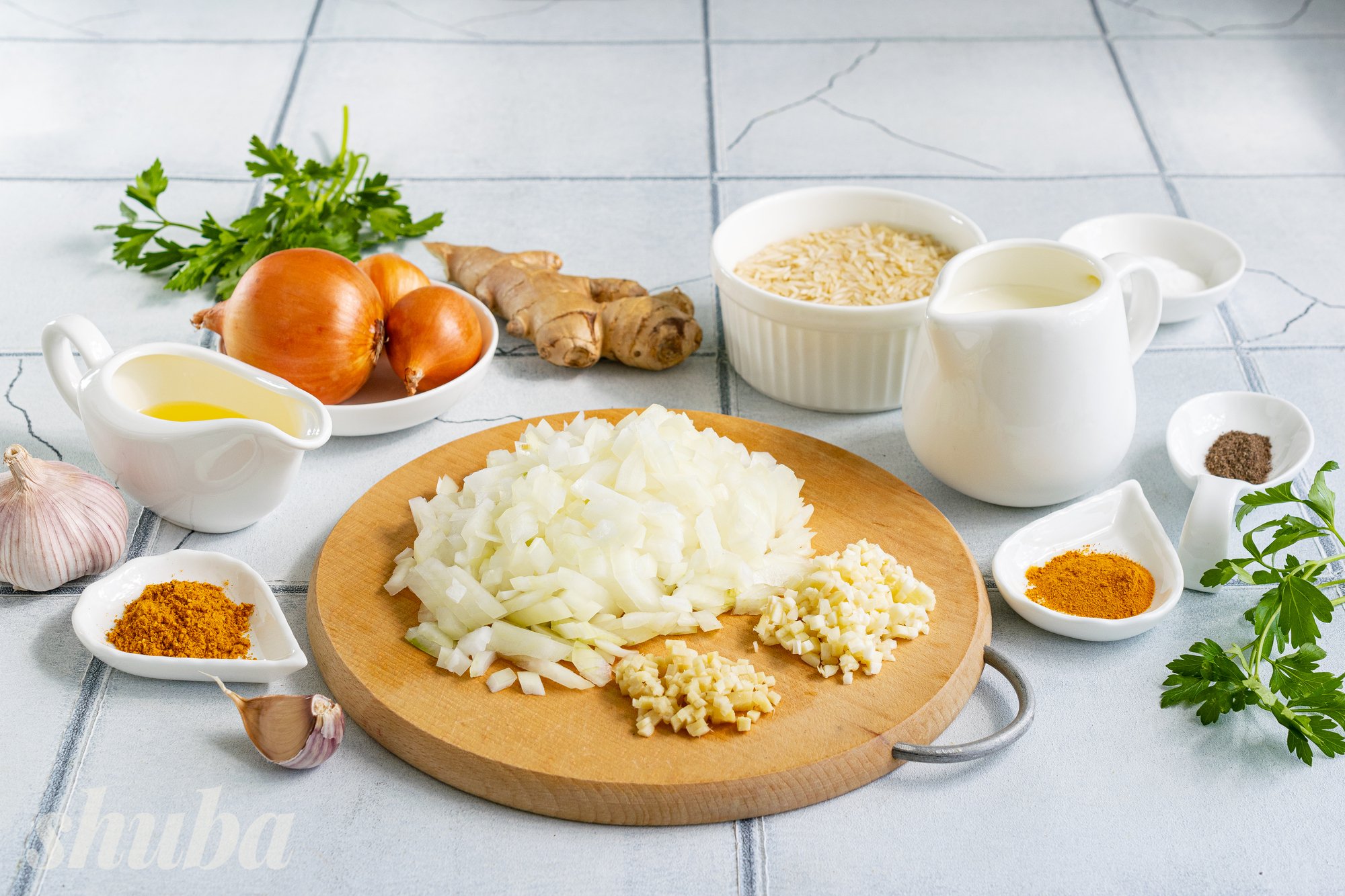 Цибулю очисти від лушпиння, наріж дрібним кубиком. Очищені зубчики часнику та корінь імбиру подрібни.