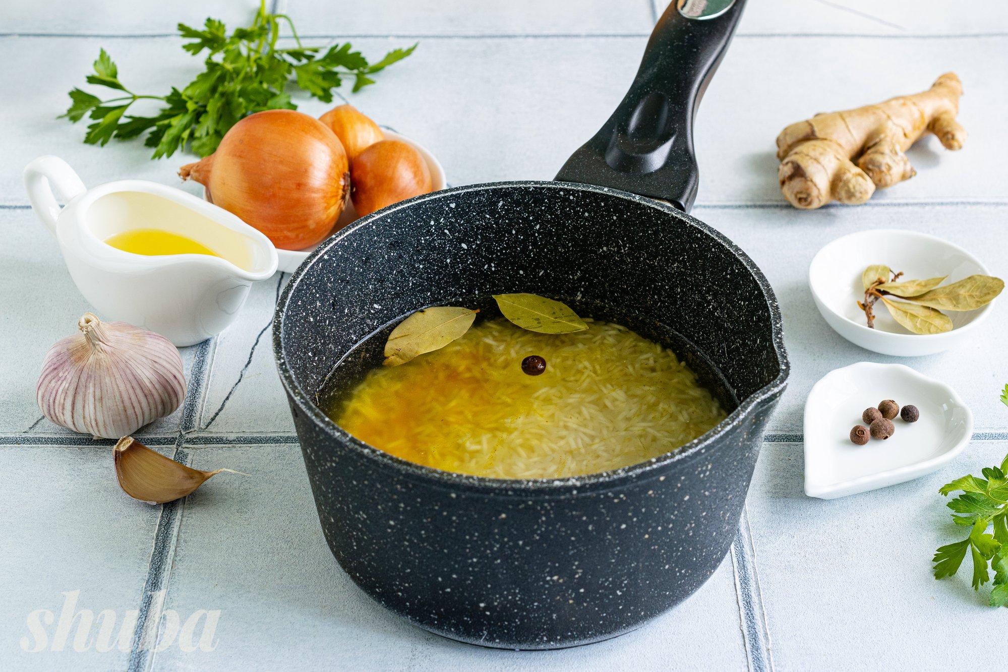 Ретельно промий басматі під проточною водою, переклади у ківш або невелику каструлю. Залий рис холодною водою у співвідношенні 1:2. Для аромату додай горошину запашного перцю та лавровий лист. Щоб рис набув красивого золотистого відтінку, всип у воду половину чайної ложки меленої куркуми, додай сіль за смаком.