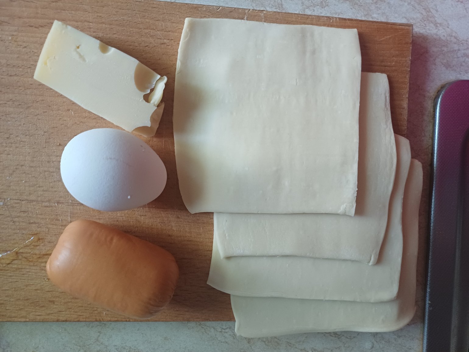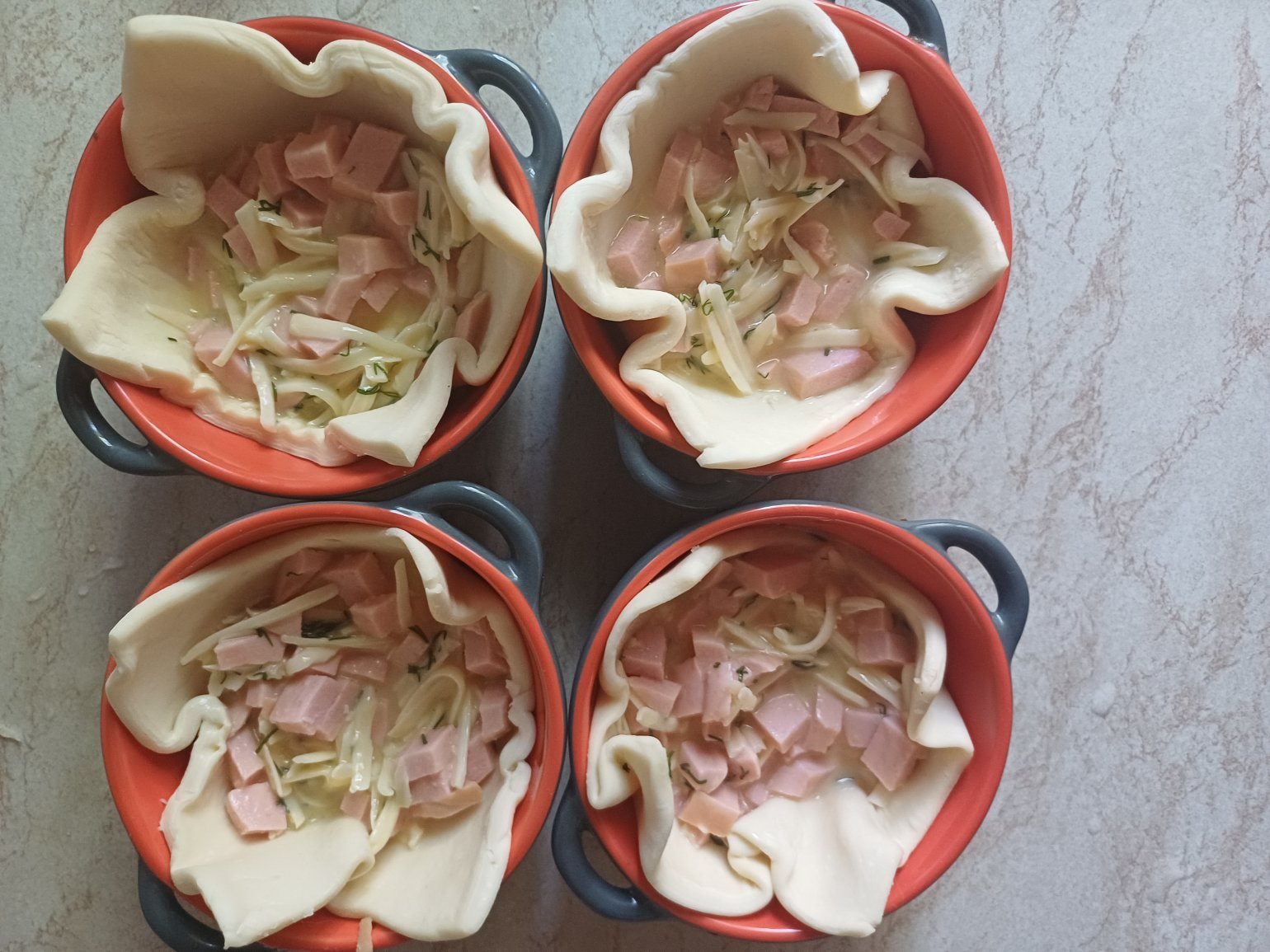 У формочках робимо кошики, покладемо туди нарізану сардельку або сосиски, натремо зверху сир та заллємо яйцем. Власне, це всі маніпуляції.