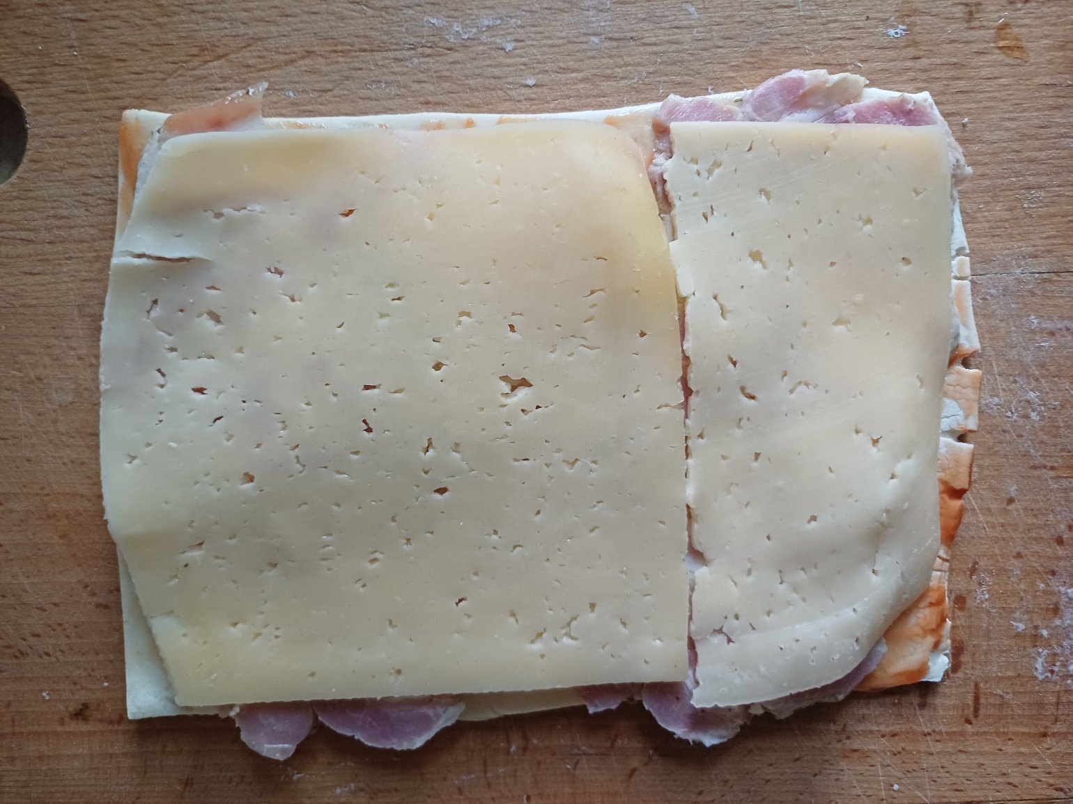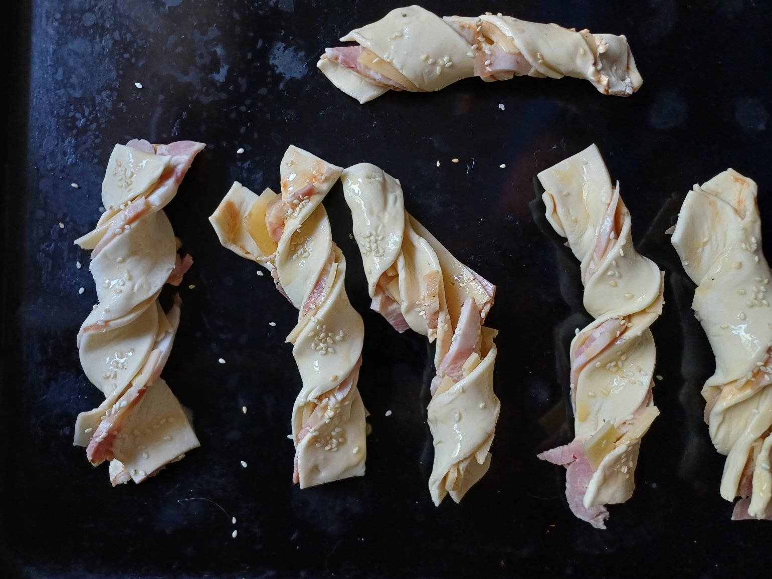 Готове листкове тісто розділимо на два прямокутники. Один змастимо кетчупом, викладемо у нього бекон (можна й шинку) і слайси твердого сиру. Потім розріжемо на смужки і скрутимо кожну в спіраль.
