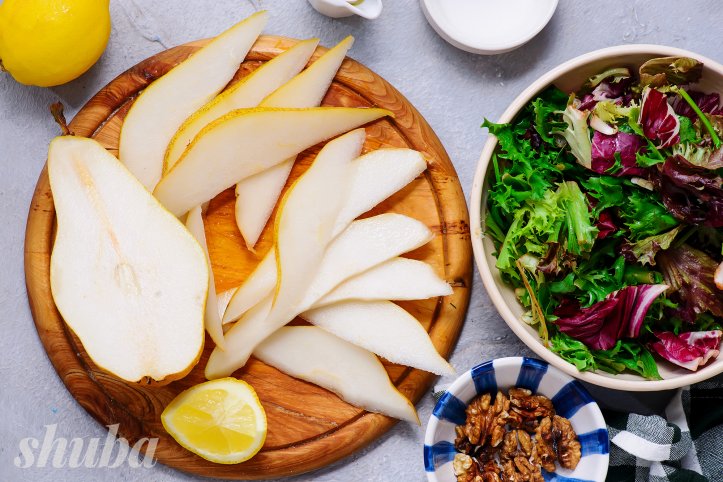 Груші вибирайте тверді, без вм’ятин, при натисканні вони мають трохи піддаватися, тобто — спілі. Ви можете збризнути груші невеликою кількістю лимонного соку після того, як наріжете, щоб зупинити потемніння.