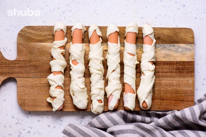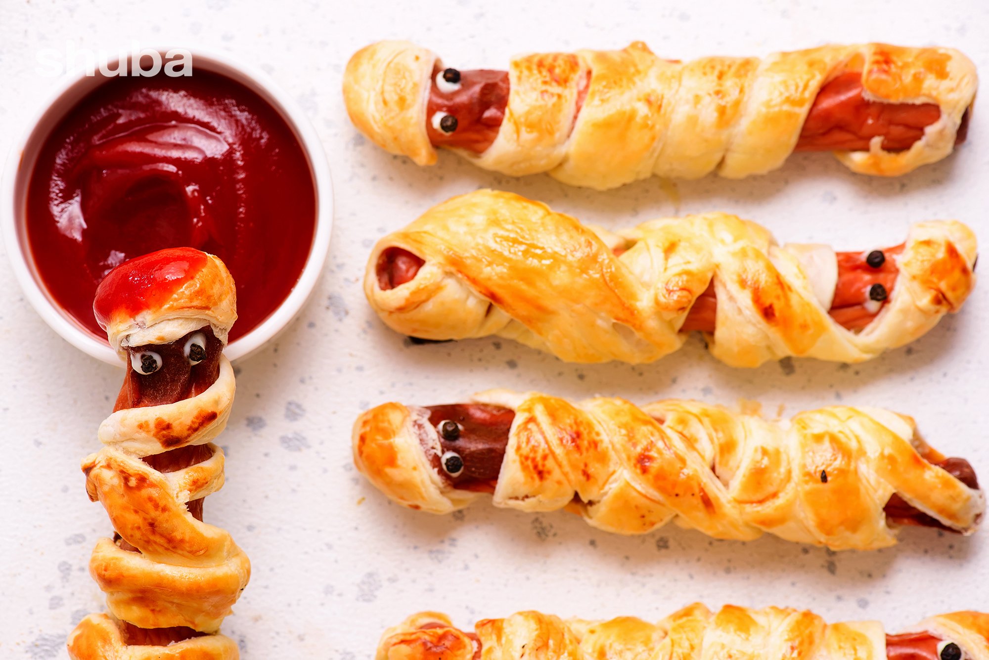 Хот-доги у вигляді мумій — чудова ідея для страви чи закуски на Гелловін. Смачні ласощі сподобаються дорослим і дітям, повеселять гостей на будь-якому столі. Вам знадобиться готове листкове тісто.