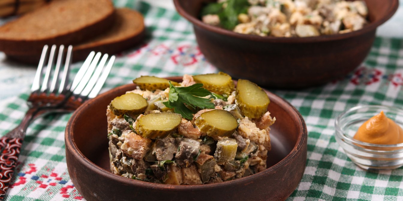 Салат из печени и омлета, приготовленного на сковороде или в духовке, лучше всего подавать с поджаренными гренками.