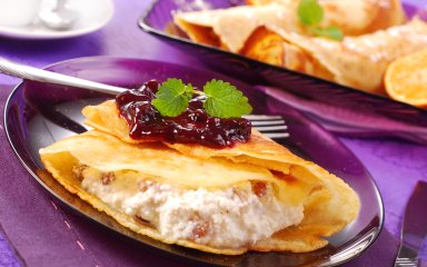 Пшенные блины с творогом и изюмом прекрасны как отдельное блюдо на завтрак или как десерт.