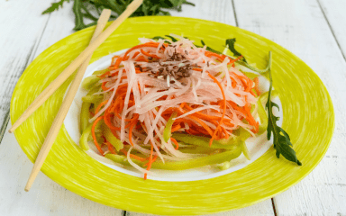 Морковь и дайкон — две стороны одной монеты, они дополняют друг друга в простом салате по-корейски. Маринад готовить не больше 5 минут. Дополнить вкус можно семенами кунжута — сырыми или поджаренными.
